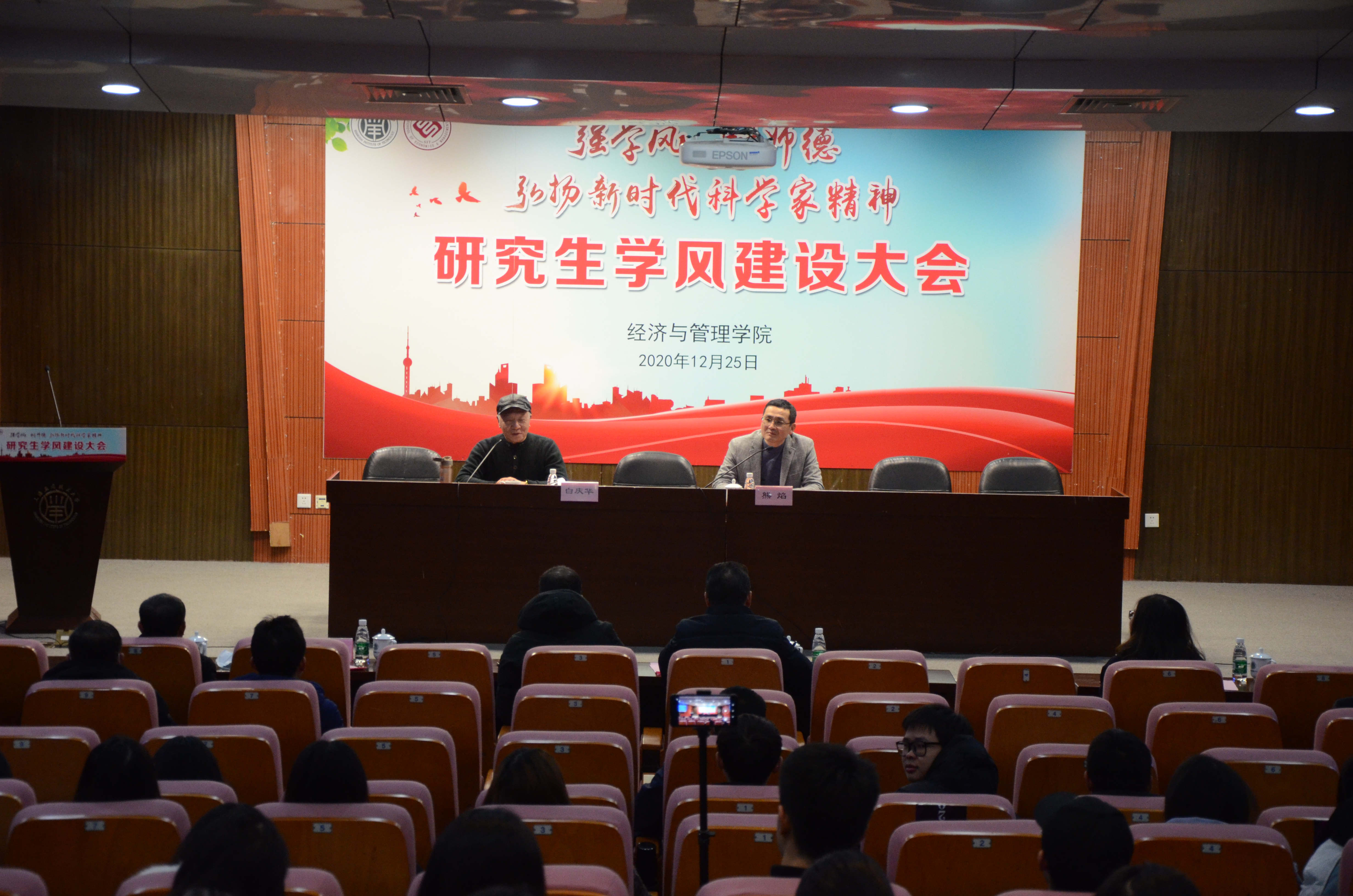 1225日,经管学院举行“强学风 树师德 弘扬新时代科学家精神——研究生学风建设大会”,校党委书记郭庆松、副校长毛祥东出席大会。经管学院党委书记王真,副书记、副院长朱菁,副院长于本海,部分研究生导师和全体研究生参加会议。会议由经管学院院长熊焰主持。