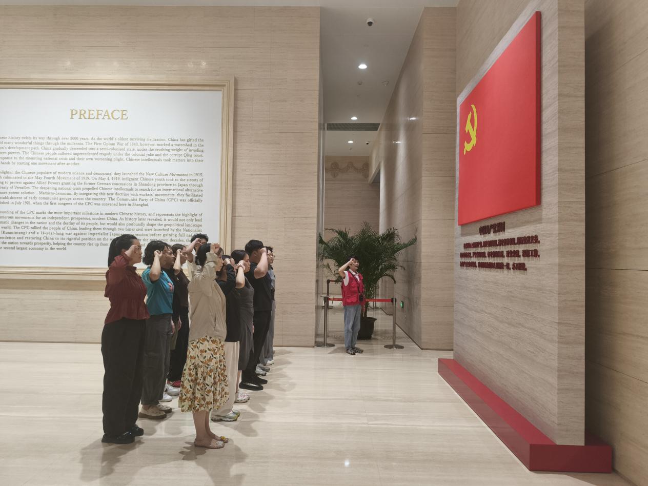 新生党员在讲解员的引导下,走进“伟大的开端”主题展厅,通过珍贵的历史文物与生动的场景复原等,系统了解从鸦片战争后中国人民的抗争到中国共产党成立的必然过程。在“开天辟地”展区,大家驻足凝视中共一大代表群像,深入感悟党在孕育之初的艰辛与坚定。随后,全体新生党员在党旗前整齐列队,高举右拳庄严宣誓,重温入党时的赤诚与承诺。