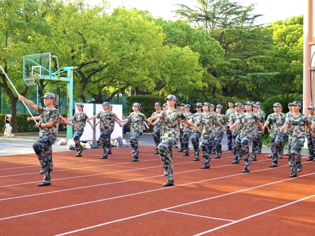 徐汇校区田径场上,2025级新生军训正有序进行。五营经管学子意气风发,听从指挥,一丝不苟地完成各项训练任务。