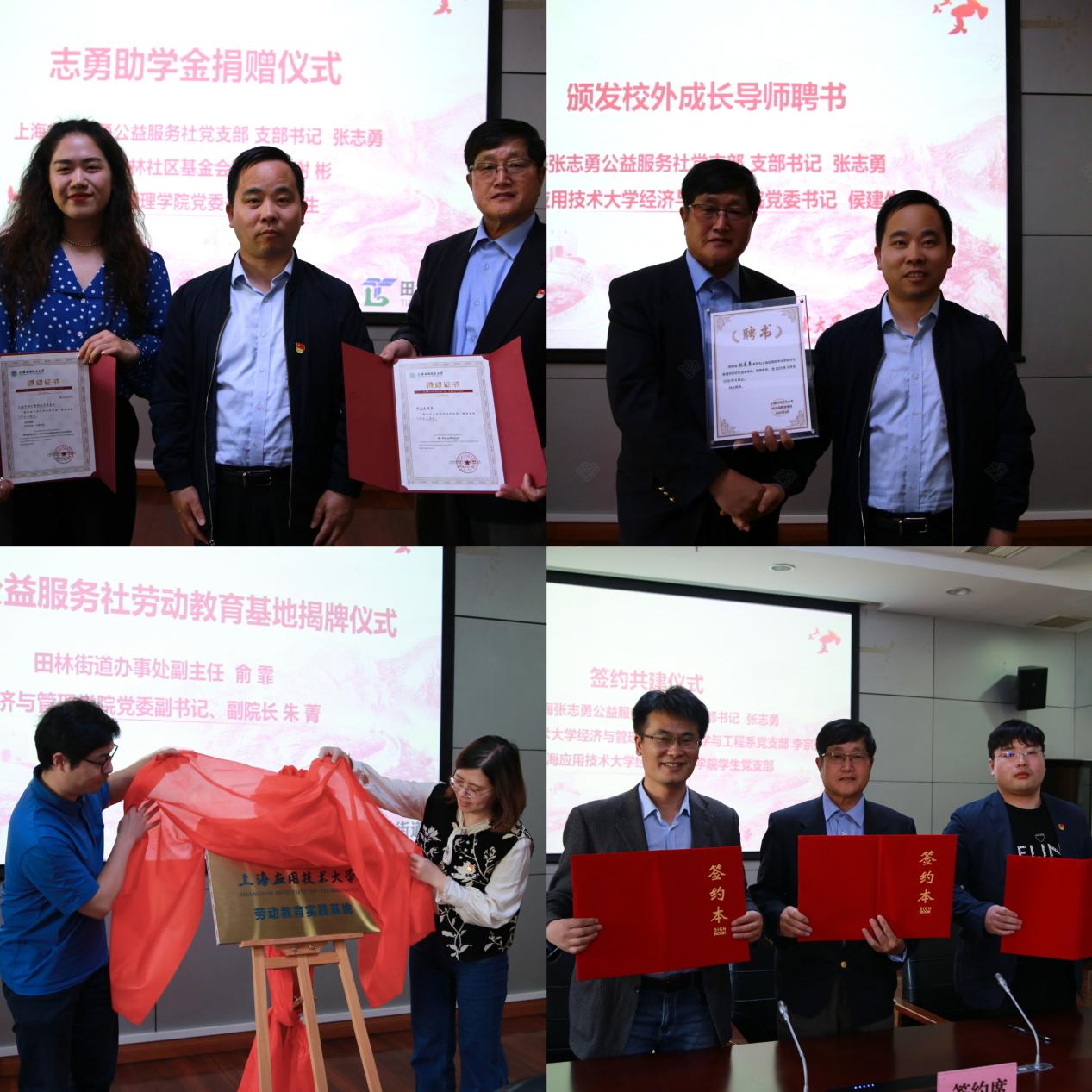 在支部签约共建环节,田林辖区上海张志勇公益服务社党支部与上海应用技术大学经济与管理学院管理科学与工程系党支部、学生党支部签约共建,在党建共建、志愿服务等方面合作,开启了新篇章。同时,学院在上海张志勇公益服务社设立劳动实践基地,侯建生为张志勇颁发校外成长导师聘书以及捐赠证书。此前,张志勇通过上海市田林社区基金会向学校捐赠款项设立志勇助学金,用来帮助学校贫困学生完成学业。