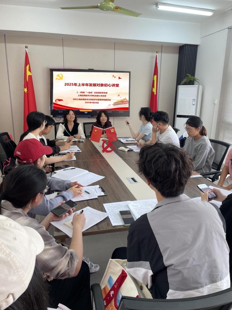 4月28日,上海应用技术大学机关第七党支部、中共上海应用技术大学经济与管理学院委员会深入3-4号和12号“一站式”学生社区,举行“2025年上半年发展对象初心讲堂”活动。活动由经管学院组织员朱秀主持,机关第七党支部支部书记、财务处处长王珍和财务处杨青受邀参加,3-4和12号楼宇临时党支部书记蓝火田、经管学院本科生第一党支部书记沈君参与分享讨论。