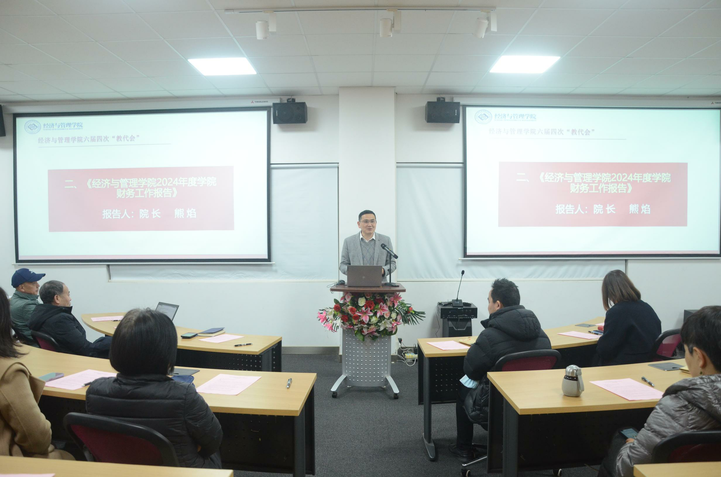 院长熊焰代表学院作《经济与管理学院2024度学院工作报告》《经济与管理学院2024度学院财务工作报告》。他表示,我们以习近平新时代中国特色社会主义思想为指导,认真学习贯彻全国教育大会精神、党的二十届三中全会精神,把牢社会主义办学方向,围绕学校党纪学习教育、巡视工作、建校70周年、本科教育教学评估等重大工作,聚焦学院管理科学与工程博士点申报、人才培养改革、AACSB国际商学院认证等核心任务,在全院师生的共同努力下,特别是广大代表的拼搏努力下,所书写的每一笔都力透纸背,所走过的每一步都掷地有声,推动学院取得新发展。希望各位代表做学院发展的建言者、推动者、行动者,大家团结一心,干字当头,奋力一跳,全面深化改革,为教育强国建设和学校高质量发展贡献经管人的智慧和力量。