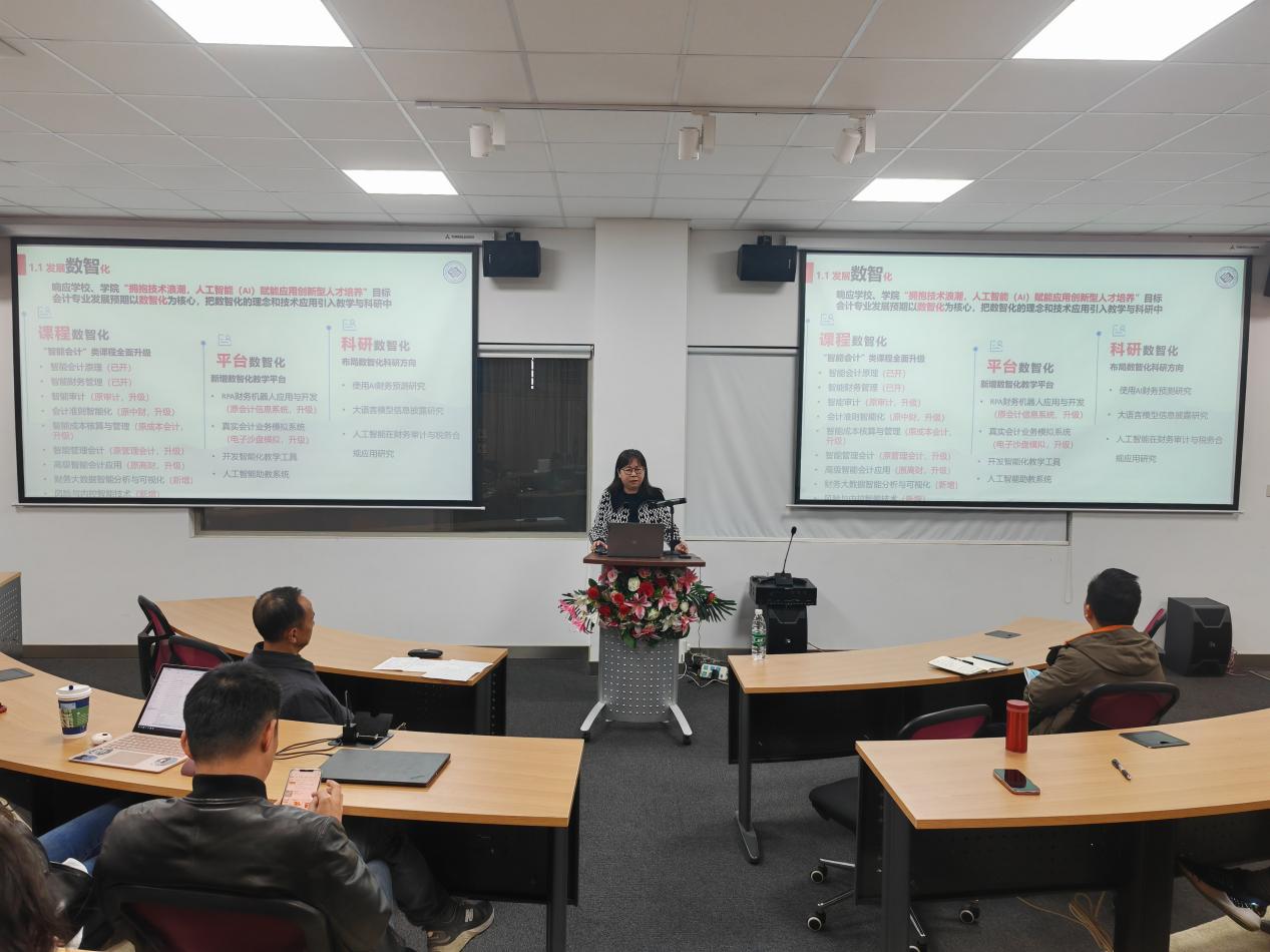 会计系系主任谢琨从数智赋能的角度出发,阐述了会计专业未来三年的发展规划。她表示,会计学专业将通过在“教学内容——教学资源——教学手段”三个维度实现数字化转型,在“学科专业——课程体系——教学团队”三个层面上加强交叉融合,全面推动专业转型发展。