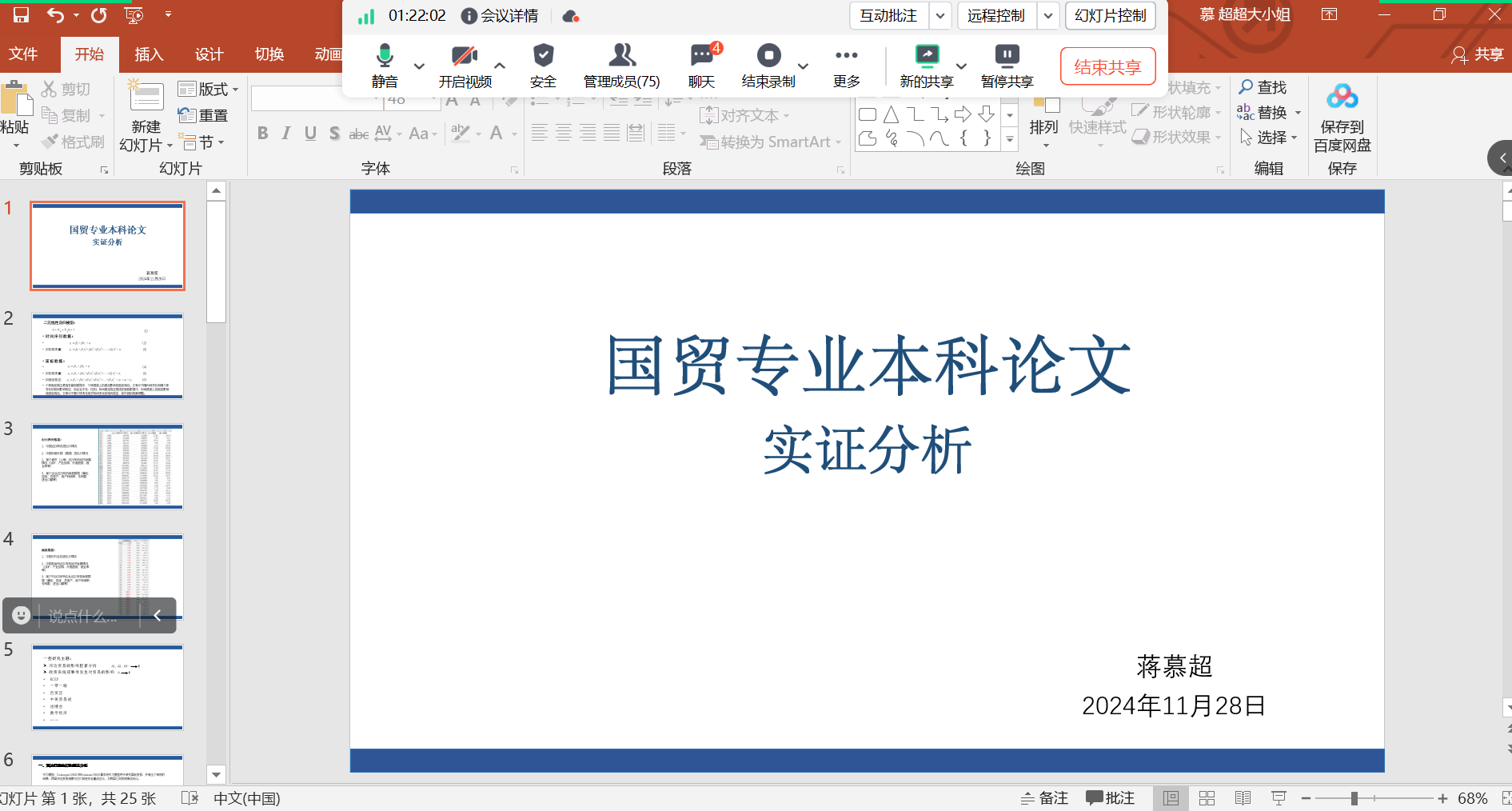 2024年11月28日晚上19点30分,我校经管学院国际商务系蒋慕超老师为大四学生开展了一场线上论文实证分析辅导讲座。本次讲座旨在帮助大四学生提高毕业论文实证分析能力,确保论文质量,为顺利毕业打下坚实基础。