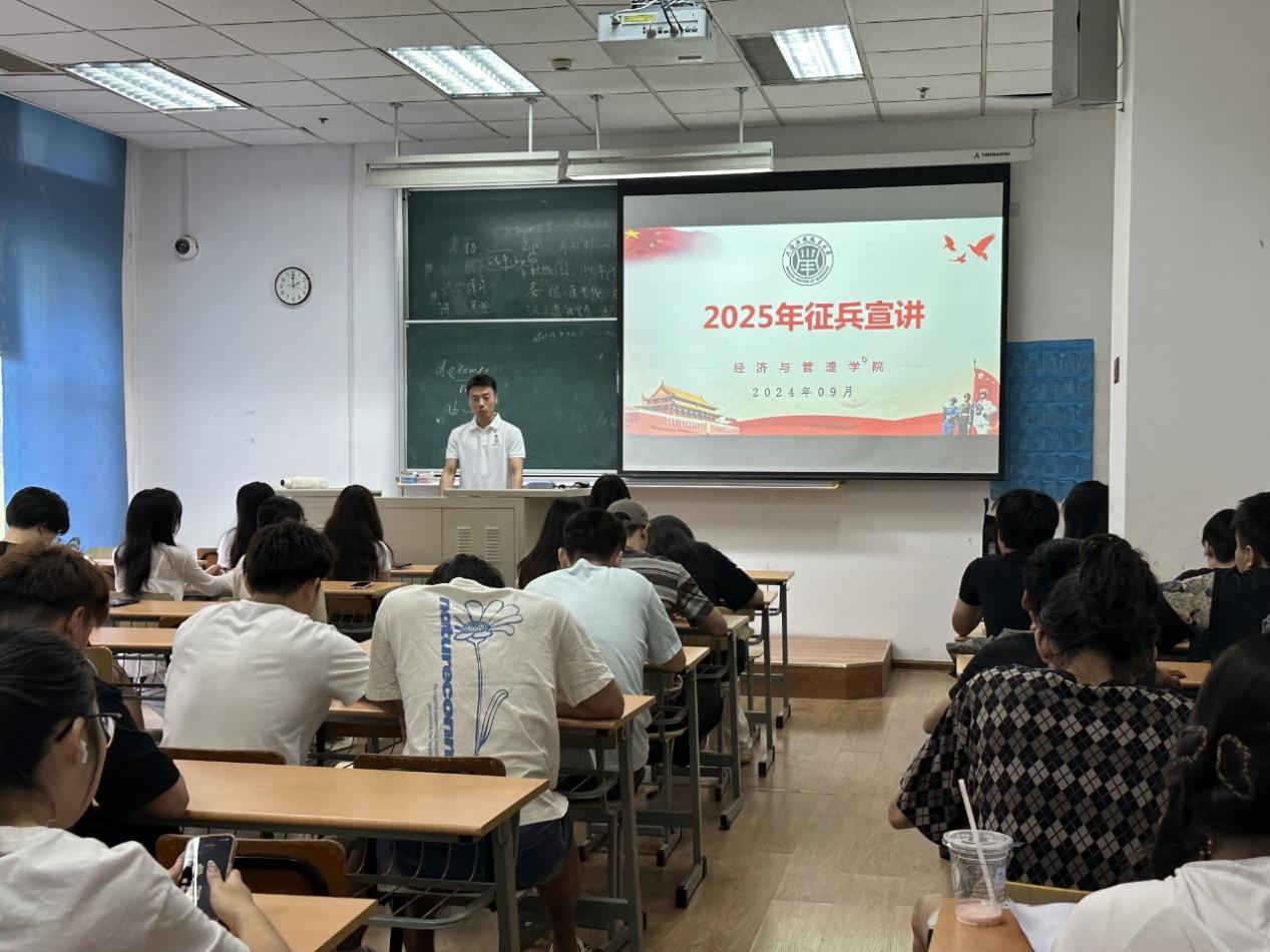 为响应国家征兵号召,鼓励同学们积极投身国防事业,经管学院于9月6日14:00在徐汇校区图书馆126教室举办征兵宣讲会。我院退伍毕业生张博炜、2024年应征入伍毕业生赵一凡、吴晓琳担任主讲人,学院共60余名大三大四学生参加讲座。