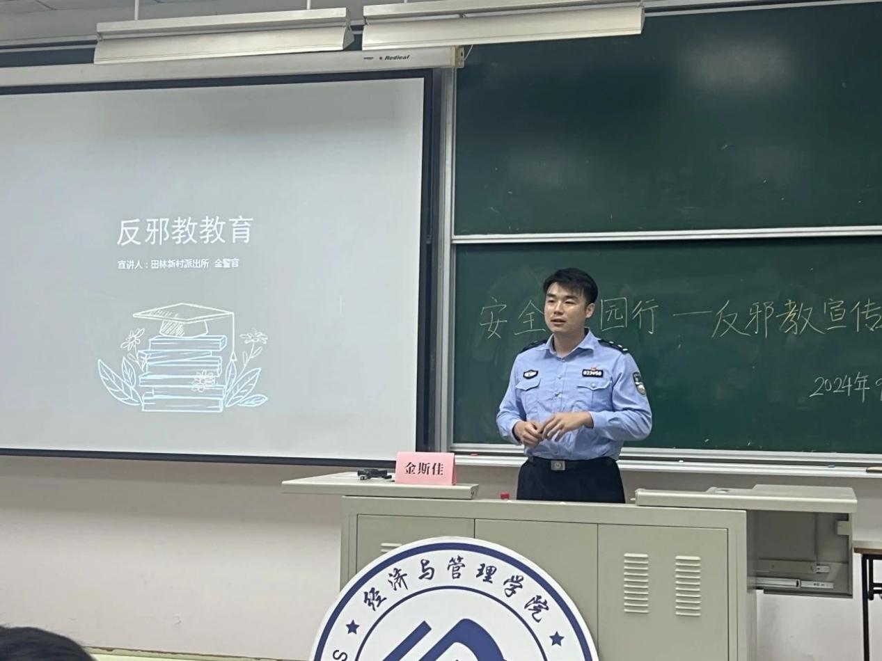 为深入推进法治校园建设,增强同学们的法治意识和自我保护能力,2024年9月25日,经济与管理学院于徐汇校区图书馆B108举行“安全校园行——反邪教宣传进校园”讲座。田林新村派出所金斯佳警官担任主讲。