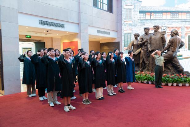 在中国共产党第一部党章诞生地——中共二大会址,毕业生党员重温入党誓词,2024年上半年发展的新党员进行入党宣誓。