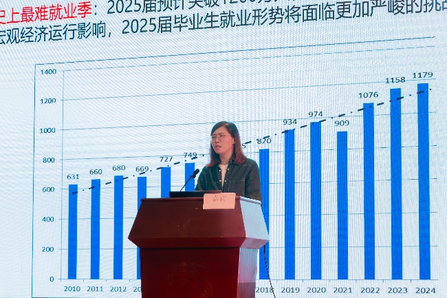 经管学院党委副书记、副院长朱菁进行动员讲话。她从2025届毕业生就业形势和各类就业去向分析两方面展开,鼓励同学们多听建议、理性选择、抓紧完善、尽早落实。