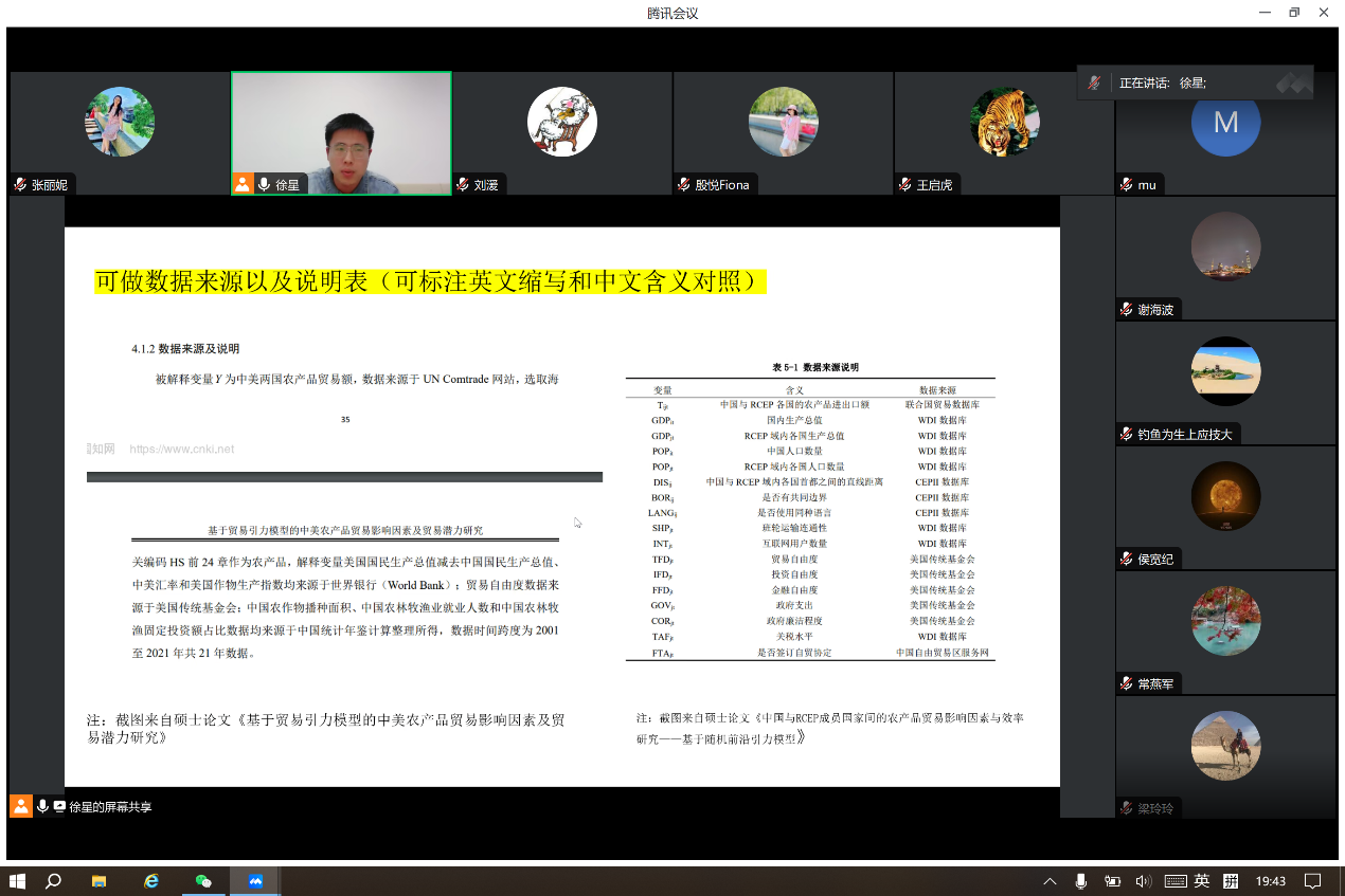 徐老师首先阐述了研究假设的重要性,指出一篇优秀的本科论文应围绕一个核心研究问题展开,并可进一步细分为多个具体的小假设。他以系主任刘湲老师去年指导优秀本科毕业论文《进博会对中国与RCEP国家食品行业贸易影响的分析》为例,展示了如何根据理论背景和先前研究,构建出有针对性的假设。在数据来源部分,徐老师详细介绍了多个国际贸易研究中常用的数据库,包括CEPII数据库、联合国商品贸易统计数据库(UN Comtrade)、世界银行的WITS、世界发展指标(WDI)以及Penn World Table数据库。强调了数据来源的透明度和可靠性对于实证研究的重要性,并提供了具体的数据库链接和使用说明。