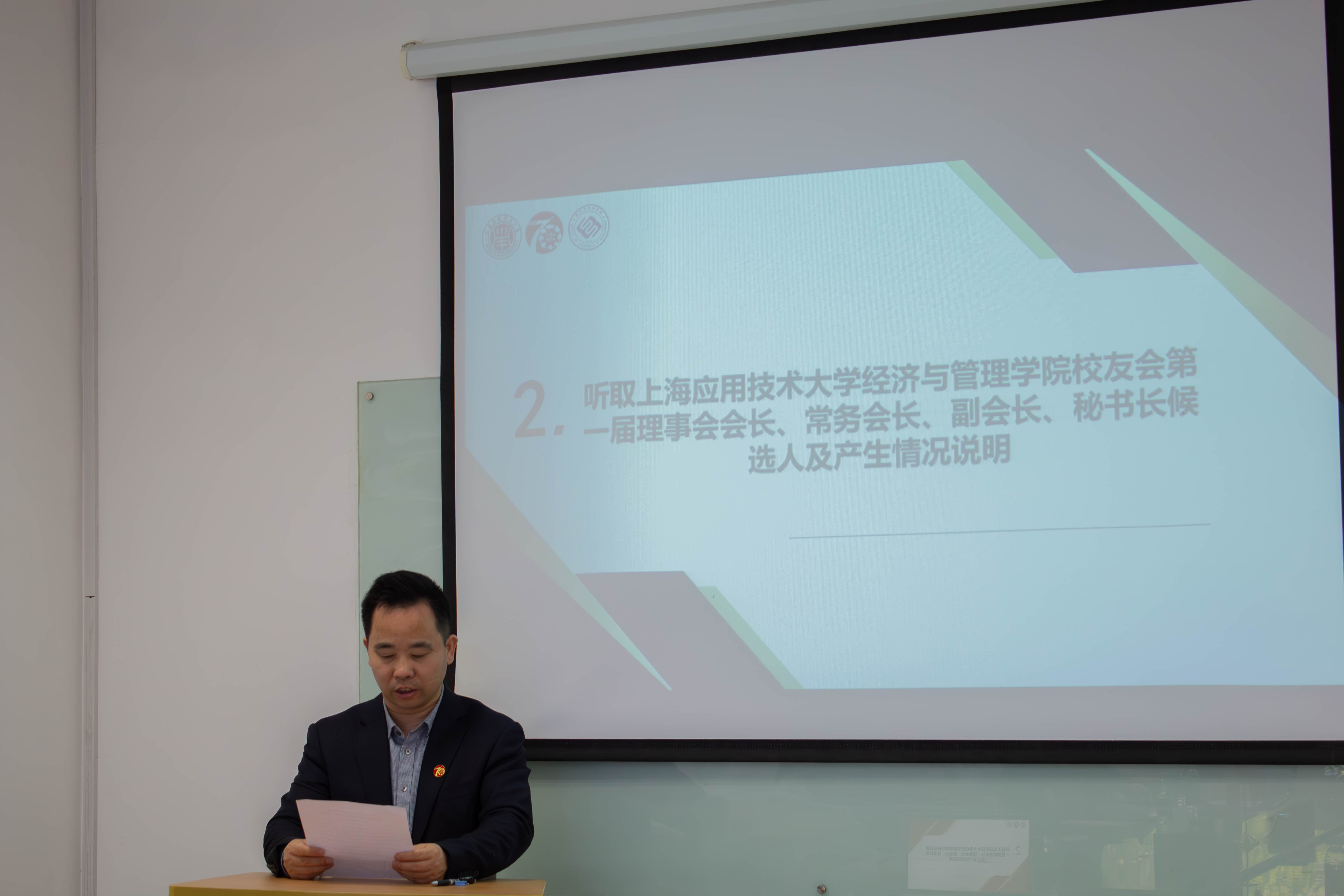 院长熊焰代表经管学院校友会筹备领导小组向与会代表介绍了学院发展情况和愿景,党委书记侯建生报告了校友会筹备情况。会议表决通过了《上海应用技术大学经济与管理学院校友会章程》、《经济与管理学院校友会第一届理事会选举办法》,并选举产生了经济与管理学院校友会第一届理事会新当选理事名单。随后,选举产生的经管学院校友会第一届理事会召开了第一次会议。经大会选举,熊焰当选会长,侯建生当选常务会长,上海浦东发展银行股份有限公司宝山支行公司五部经理潘炜华、北京企企科技有限公司副总裁殷章辉、中国工商银行淮海中路支行行长韩嘉卉当选副会长,朱菁当选秘书长。会议还审议通过了副秘书长人选。