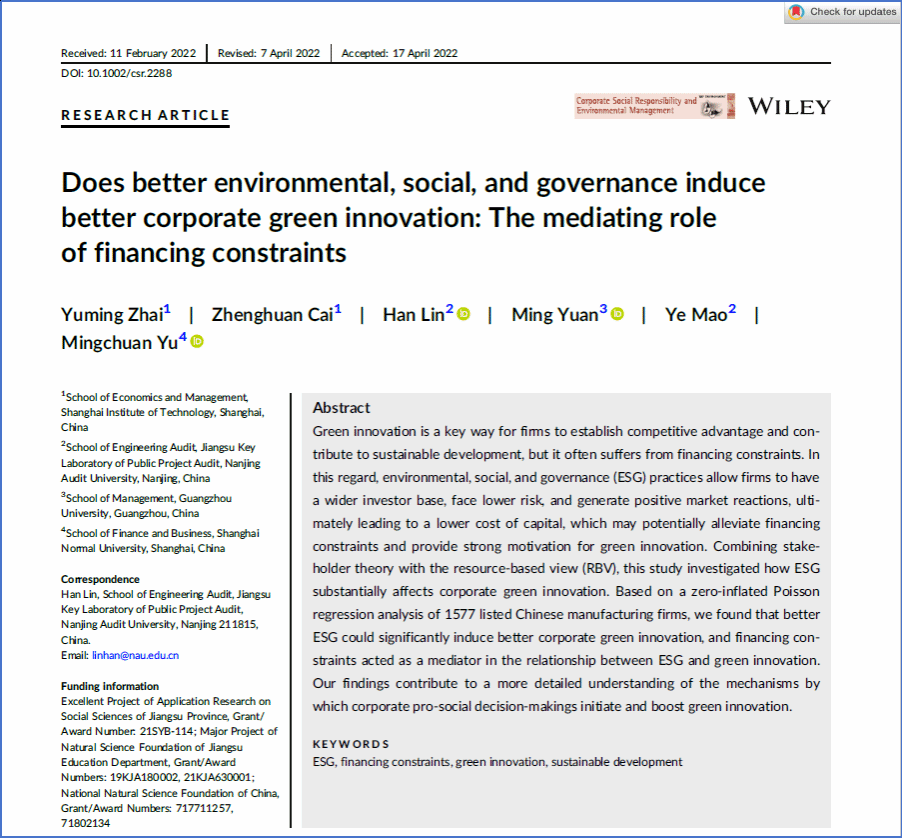 近日,我校经济与管理学院翟育明教授团队的研究成果“Does better environmental, social, and governance induce better corporate green inovation: The mediating role of financing costraints”发表在国际期刊《Corporate Social Reposibility and Environmental Management》(简称CSREM),该论文已进入ESI高被引。研究成果由我校翟育明教授、南京审计大学林翰教授和上海师范大学俞明传教授等合作完成,论文第一单位为上海应用技术大学,通信作者为南京审计大学林翰教授。