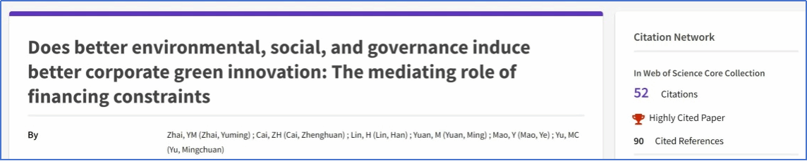 论文验证了ESG对企业可持续成长有直接和间接的影响。好的ESG表现能促使企业通过与资本市场的非财务信息交流以降低信息不对称所导致的代理成本,最终能够在更好的条件下获取第三方资源以促进企业可持续发展。同时揭示了ESG内化到企业融资以激发可持续成长动力的机制。认为好的ESG表现可以通过缓解企业融资约束而促进企业绿色创新。为ESG推动企业成为既称职又有道德的机构做出了贡献。在经济转型时期,ESG在推动制造业企业兼顾道德和竞争优势的过程中发挥了重要作用。 ESI高被引论文是指在SCIE、SSCI近十年发表的论文中,按照同一出版年、同一ESI学科论文的被引次数由高到低进行排序,排在全球前1%的论文。高被引论文科学地反映了论文作者及其研究成果的国际影响力,是全球公认的衡量学术影响力的重要指标之一。CSREM为管理学和商学领域的SSCI国际期刊,该期刊同时位列Busines(25/154)、Environmental Studies(9/127)和Management(26/227)三个学科一区,影响因子为9.8。该论文进入ESI高被引,实现了我校管理学科ESI高被引论文的突破,有助于提高我校管理学科在国内外的学术影响力。