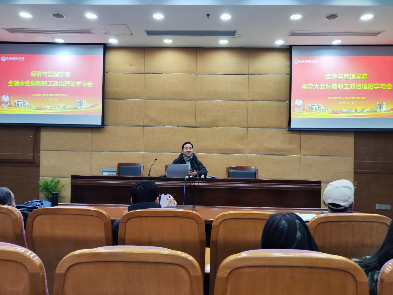 为贯彻落实学校干部大会精神,推进学院高质量发展,2024年3月1日,经管学院2023-2024学年春季学期全院大会暨教职工政治理论学习会在奉贤校区图书馆102室召开。学院领导班子成员、全教职工参会,会议由学院党委书记侯建生主持。会议总结了2023年学院主要工作,并全面部署了2024年重点工作。