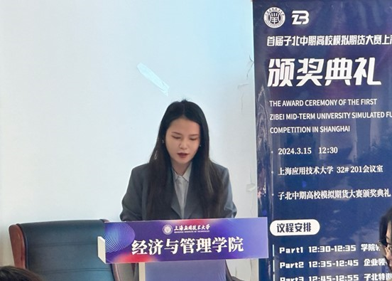 2024年3月15日,首届“子北中期杯”高校期货模拟大赛颁奖典礼在上海应用技术大学徐汇校区举行。香港万宇资本总经理王震、上海子北科技有限公司总经理助理李婧祺、上海应用技术大学经济与管理学院党委副书记、副院长朱菁出席,相关获奖选手及参赛学生参加此次颁奖典礼。