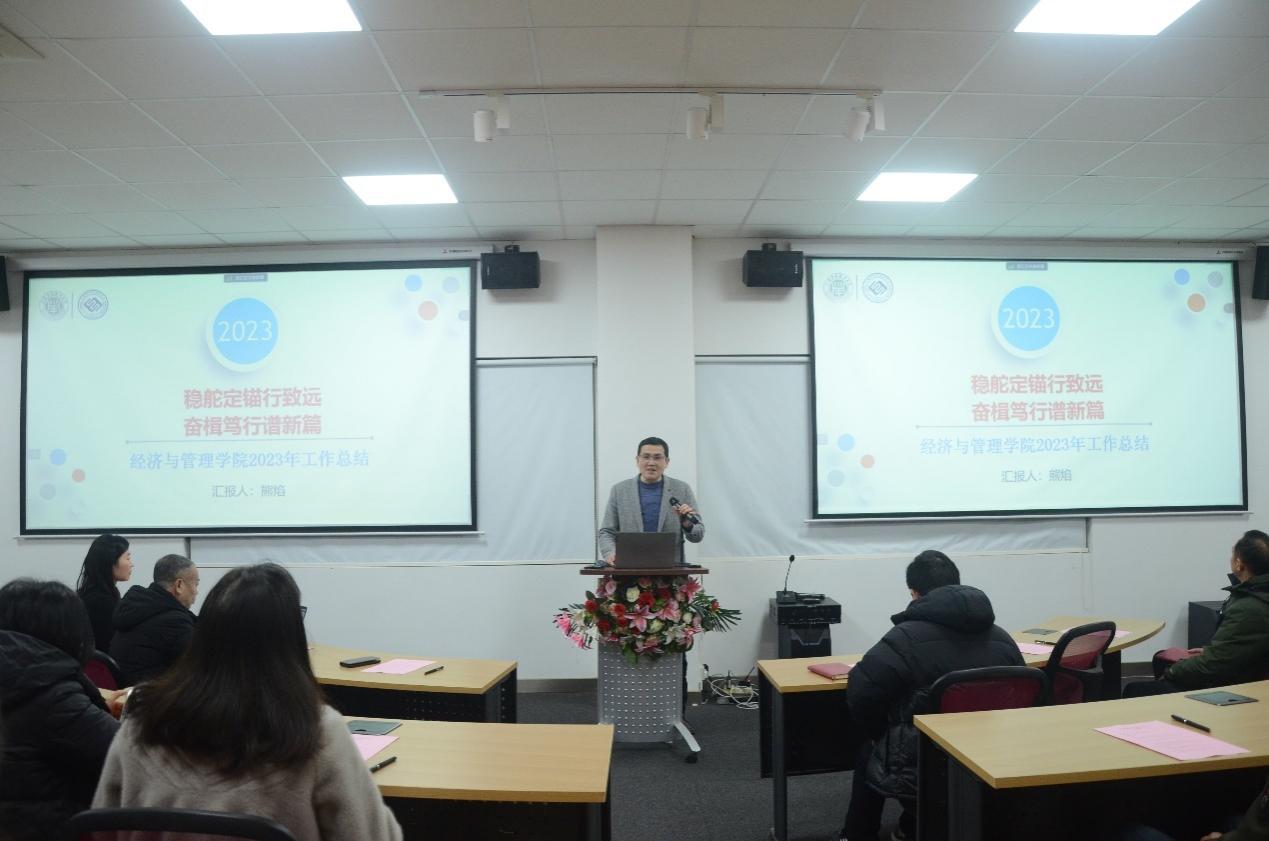 院长熊焰代表学院作《经济与管理学院2023年度学院工作报告》《经济与管理学院2023年度学院财务工作报告》。他表示,过去的一年,是非常重要的一年。学院全面贯彻落实党的二十大精神,紧紧围绕教育教学评估、博士点建设、人才培养改革、AACSB国际商学院认证等四大核心任务聚力发力,以一流党建引领经管学院发展建设,在师资队伍、学科建设、科学研究、教学工作等方面取得长足进步,学院各项事业再迈新台阶。