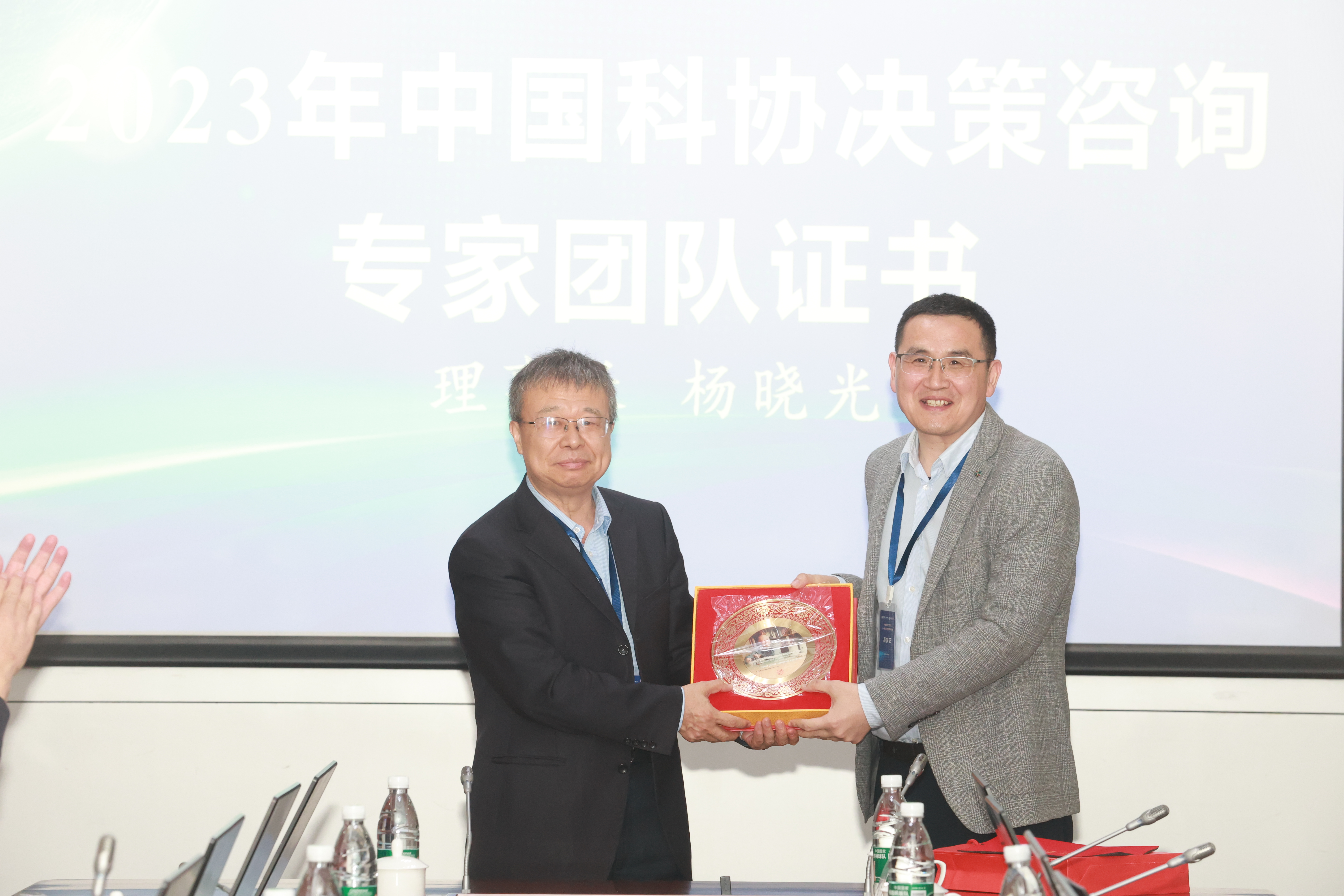 杨晓光向2023年中国科协决策咨询专家团队代表颁发证书,并代表学会向上海应用技术大学经济与管理学院院长熊焰赠送学会纪念品,感谢经管学院工作团队高质量、高效率、成功地承办了本次会议。