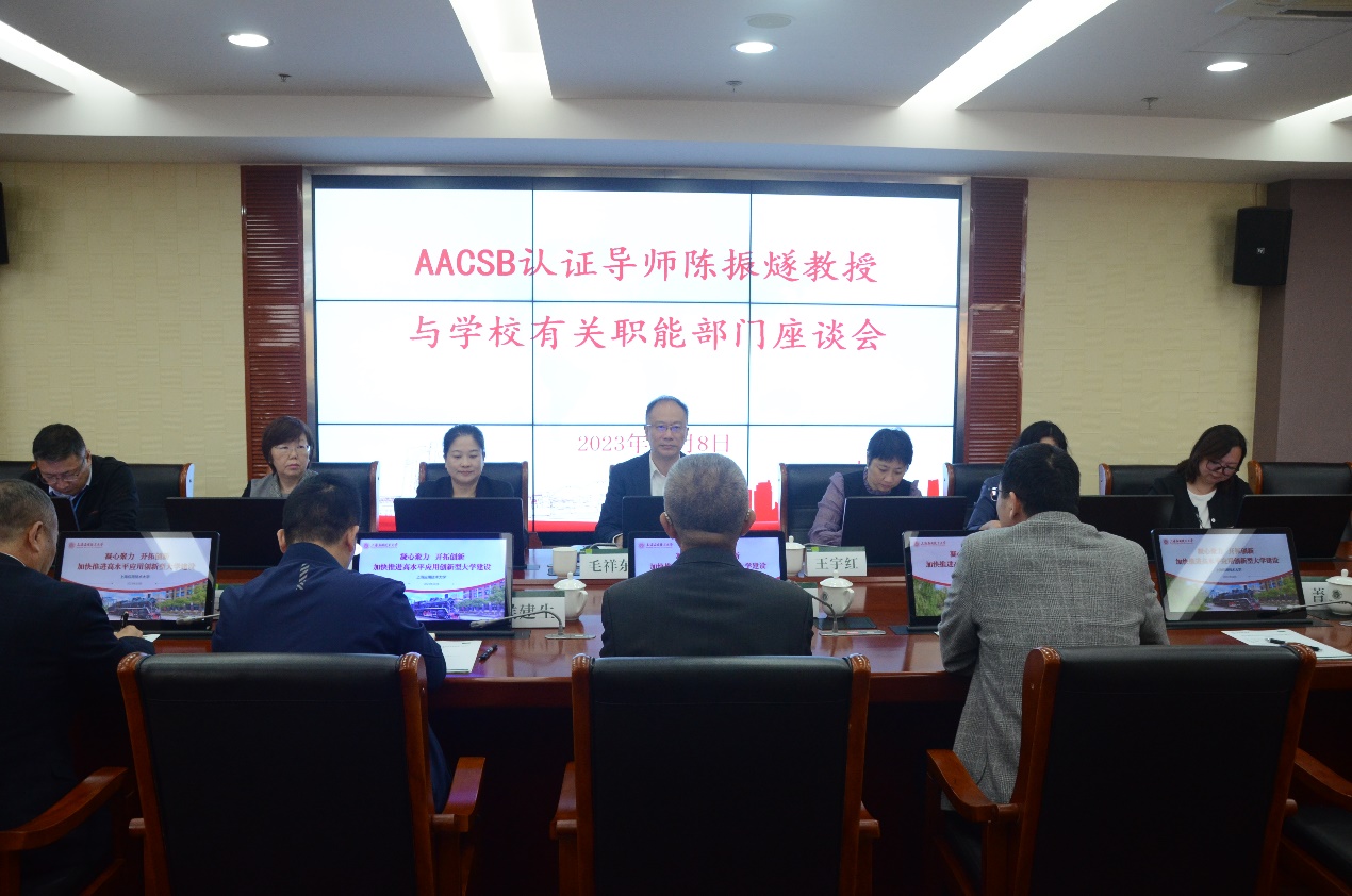 访视的第2个环节是校相关职能部门与专家的交流座谈会,副校长毛祥东主持会议,学校人事处、财务处、教务处、国际交流处、研究生院、资产与实验室管理处等部门负责人出席会议。毛祥东在会谈中介绍了学校的办学特色,指出学校支持经管学院加大改革力度、锐意进取,在教学、科研、管理等各个方面办出水平、办出特色,希望经管学院把这次AACSB认证作为新的起点,找准学院发展的短板,以AACSB各项标准指导学院建设,把学院各项工作推向新高度。陈振燧教授与学校各部门负责人就学生发展与支持、课程管理与学习质量保障、财务预算支持、师资管理与发展、科研水平、国际化水平、社会服务等方面进行了深入座谈交流。