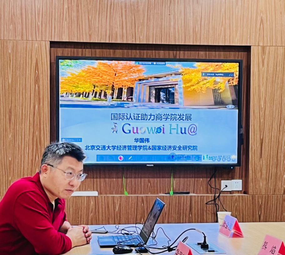 为进一步提高经管学院教育教学质量,推进经管学院国际认证工作和国际化发展,2023年10月13日下午,学院邀请了北京交通大学国家经济安全研究院执行院长,经济管理学院华国伟教授来校做报告。学院领导班子全体成员、参与认证学科项目负责人及认证办公室全体成员参会。