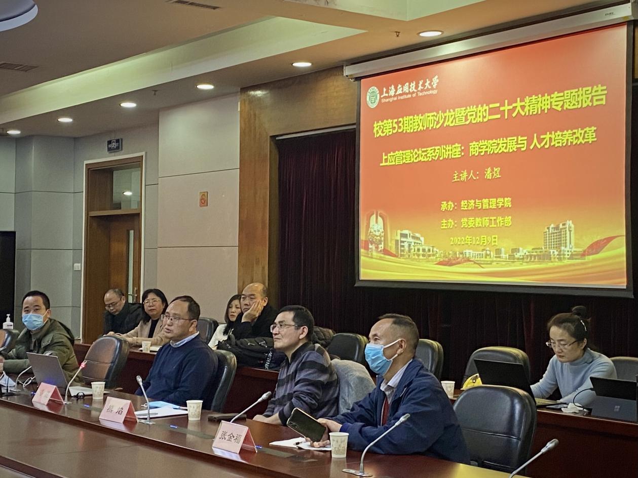 12月9日下午,由校党委教师工作部主办,经管学院承办的校第53期教师沙龙暨党的二十大精神专题报告会举行。上海外国语大学国际工商管理学院院长潘煜教授应邀作专题报告《商学院发展与人才培养改革》,报告采用线上、线下相结合的形式展开。经管学院领导班子及全院教职工听取专题报告,经管学院院长熊焰主持会议。
