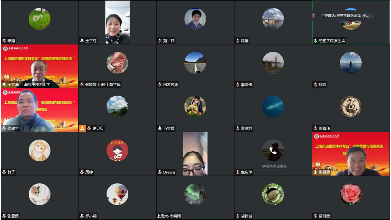 12月15日下午,上海市应用型本科专业“信息管理与信息系统”建设验收会在云端举行。经管学院党委书记侯建生主持会议。本次验收会评审专家为合肥工业大学科研院副院长、管理科学与工程教学指导委员会委员、信息管理与信息系统组副组长梁昌勇教授,上海外国语大学商学院副院长马宝君教授,上海应用技术大学教务处处长王宇红教授和用友网络科技股份有限公司上海分公司高级实施专家钱涛经理。经管学院副院长于本海教授就项目建设情况进行了汇报,经管学院领导班子及管科系教职工参加验收会。