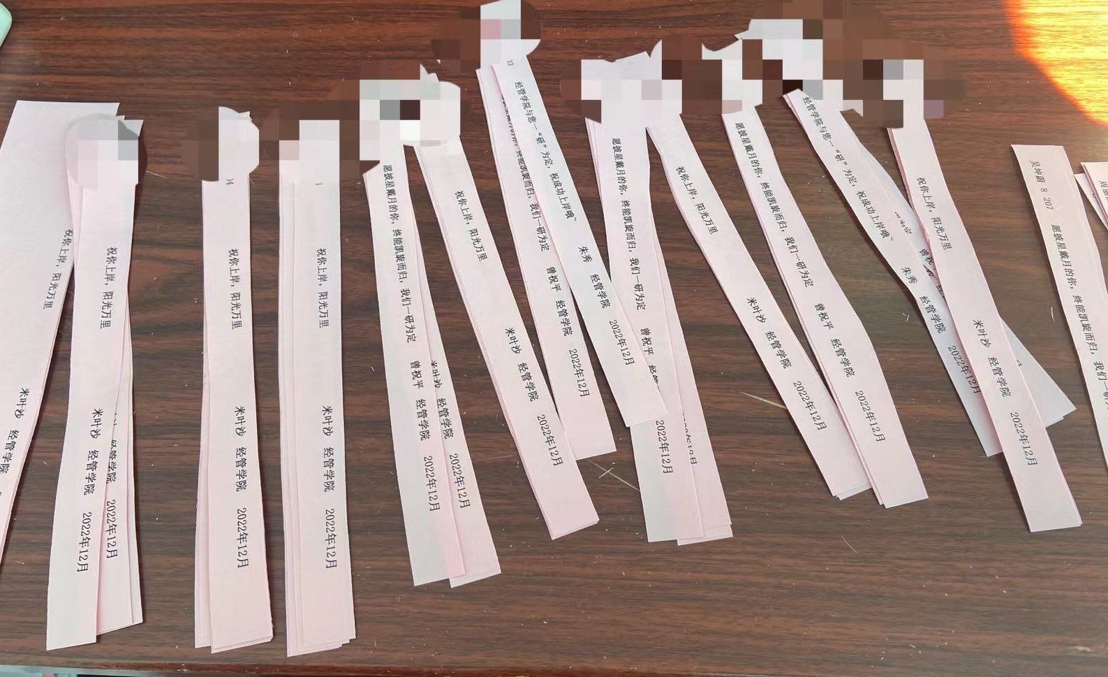 考研路漫漫,征人非只身。为成功上岸而星夜奋斗的学子身后,永远有师长在为其点一盏亮灯。辅导员老师们写下的暖人话语,每一张都各有深意,每一张都与众不同。薄薄的纸扉承载起浓浓的祝福,一份份为考研学子们亲手定制的“盲盒”是漫漫考研路上冬日初煦般的温暖。