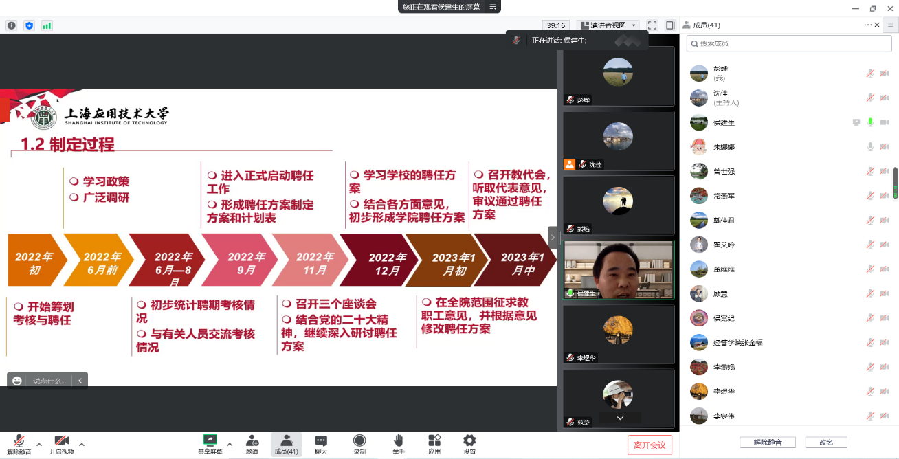 侯建生书记就《经济与管理学院2023—2025年聘期岗位聘任方案》做出阐述说明,他分别从制定过程、方案框架、基本原则、主要变动等八个方面进行详细解释。同时,也希望全体代表以高度负责任的态度,以更加强烈的主人翁意识认真讨论聘期方案,并提出宝贵的意见和建议。