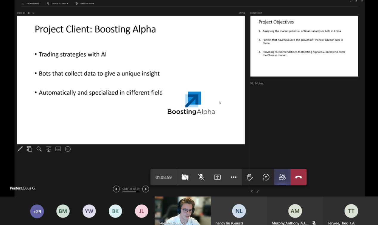 第三小组与fontys方小组的同学就Boosting Alpha B.V公司围绕着开发基于AI的智能机器人投资顾问展开一系列调研,通过问卷调查、采访、查阅资料等形式,多角度探讨国内外智能机器人投资顾问的发展情况,以及Boosting Alpha B.V公司想要进入中国市场需要采取哪些准备。具体主题是:“面对不断变化的市场环境,智能机器人投资顾问行业在国内外具有怎样的发展前景,可能会面临哪些竞争因素以及采取的解决方案。”。