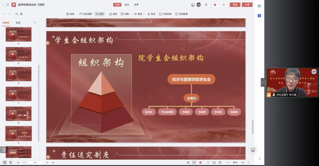喜迎二十大,奋进新征程。为鼓励同学们以实干强国兴邦,提高思想积极性,经济与管理学院学生会于2022年10月27日晚召开秋季培训会。