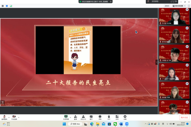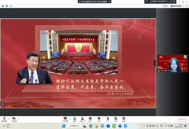 经济与管理学院学生会全体成员先是观看了两个二十大相关视频。学习了二十大报告中有关改善民生问题的重要内容以及重点“金句”,其中包括教育问题、就业政策、乡村振兴的“三农”问题、住房问题、收入分配问题和社会保障问题等,党的二十大都作出了相关表述。我们要动员全体中华儿女围绕实现中华民族伟大复兴中国梦一起努力拼搏,在国家统一的历史车轮面前,我们要坚定自信,祖国统一一定能够实现,唯有矢志不渝、笃行不怠,方能不负时代、不负人民。
