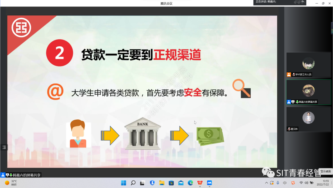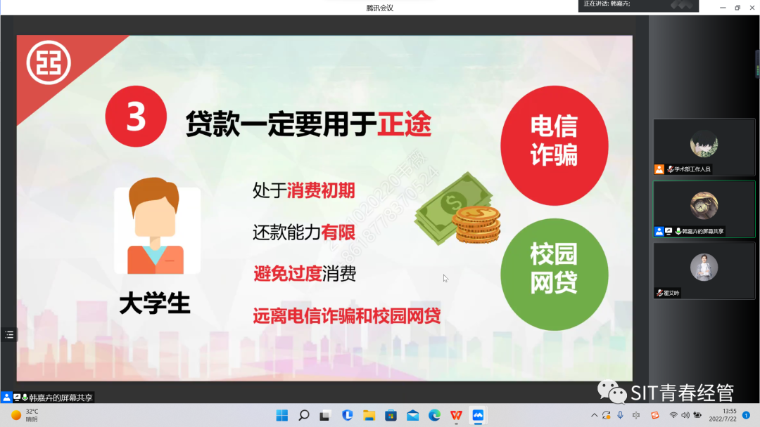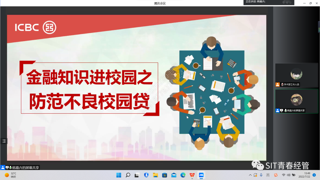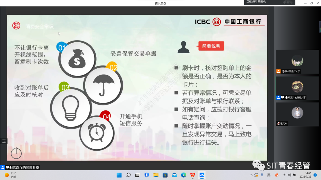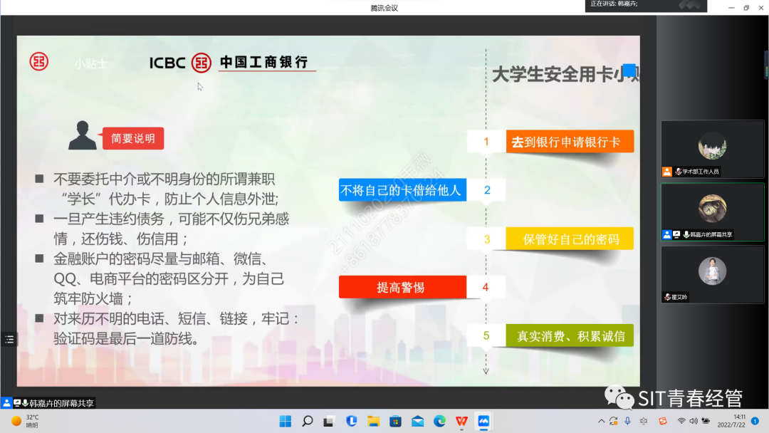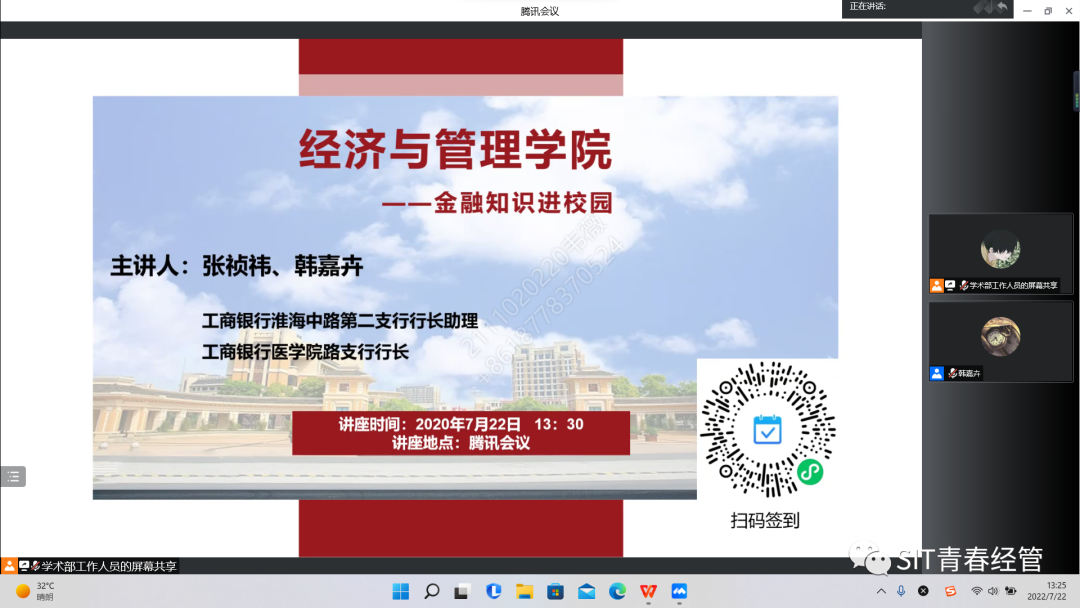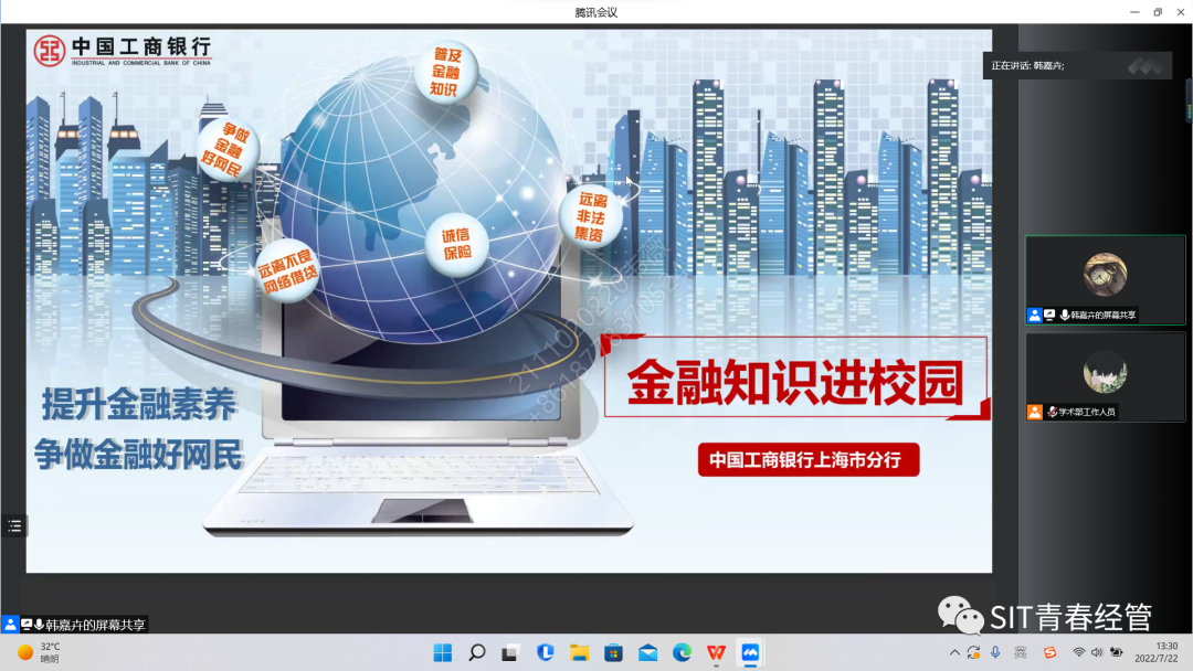 为帮助同学们树立正确的金钱观和价值观,做到理性消费,避免金融风险,2022年7月22日下午,经济与管理学院开展了“金融知识进校园”线上主题讲座。本次活动的主讲人为工商银行淮海中路第二支行行长助理张祯祎、工商银行医学院路支行行长韩嘉卉。