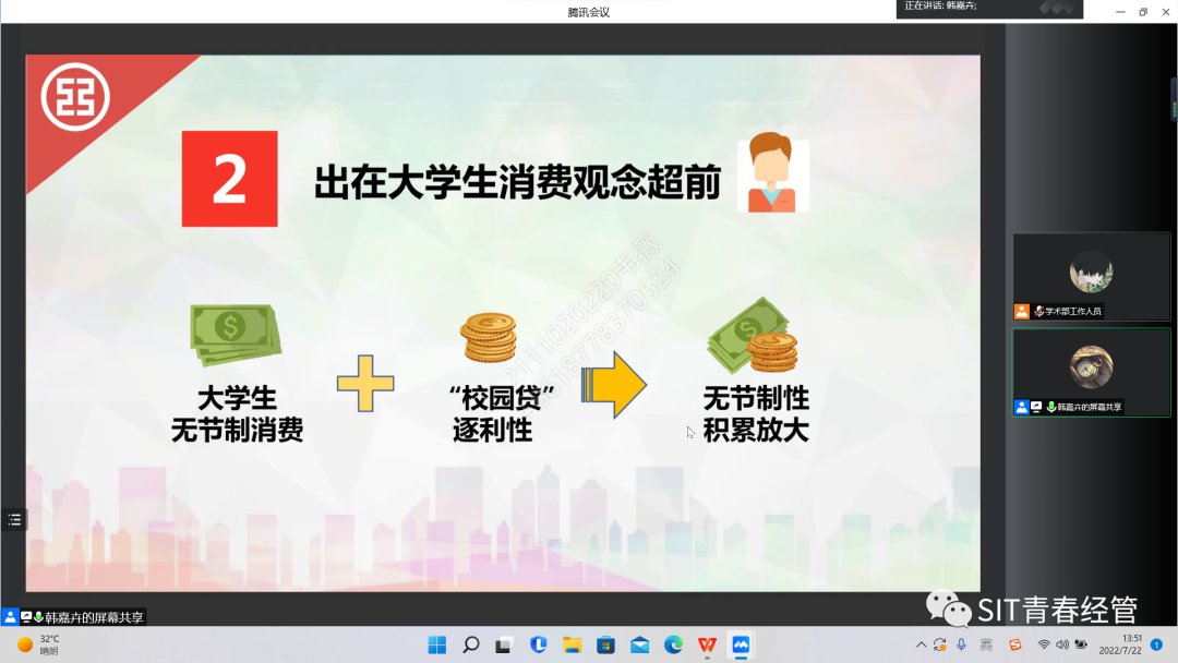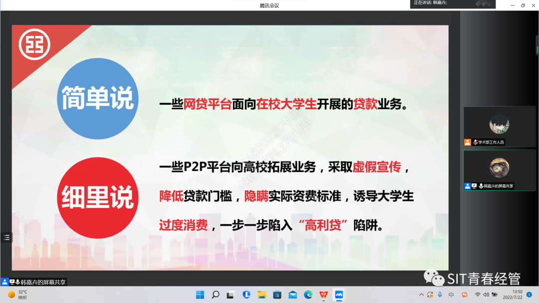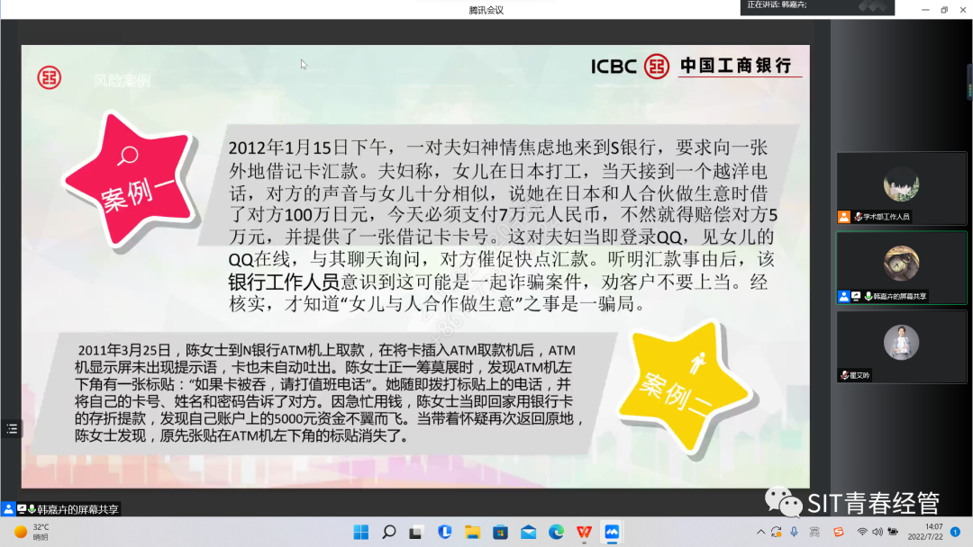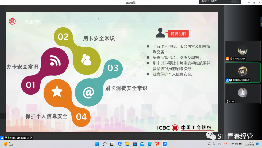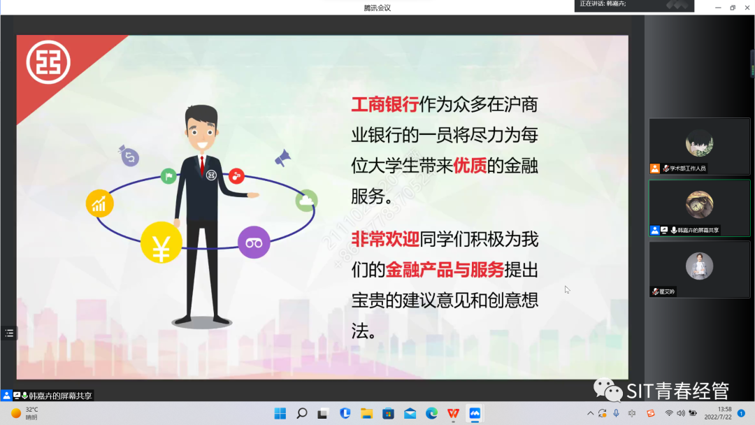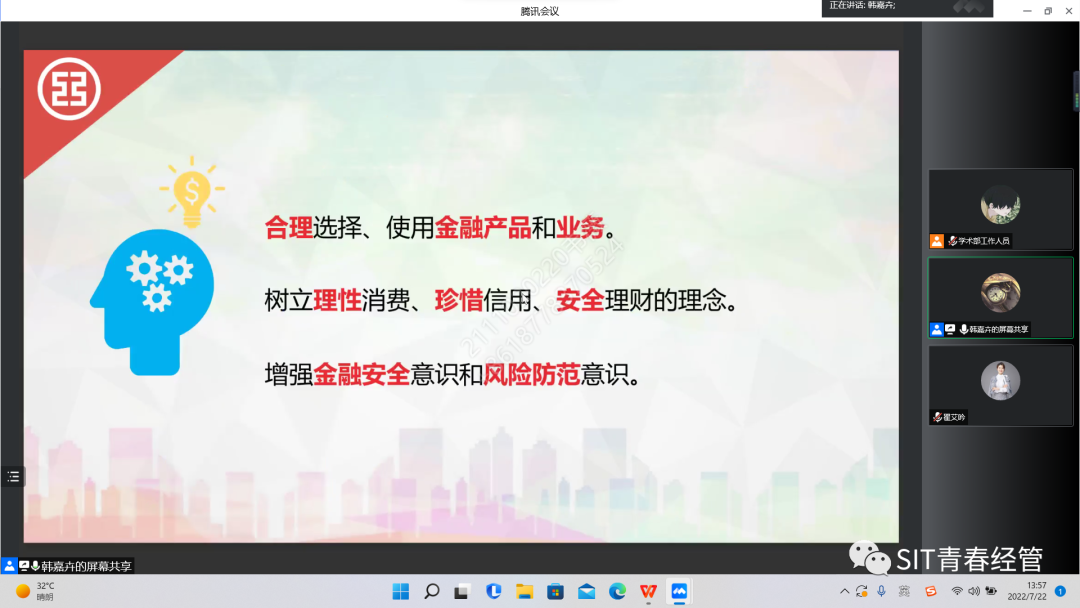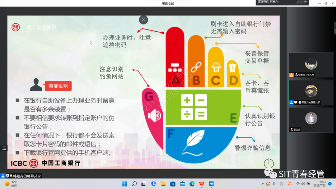 为帮助同学们树立正确的金钱观和价值观,做到理性消费,避免金融风险,2022年7月22日下午,经济与管理学院开展了“金融知识进校园”线上主题讲座。本次活动的主讲人为工商银行淮海中路第二支行行长助理张祯祎、工商银行医学院路支行行长韩嘉卉。