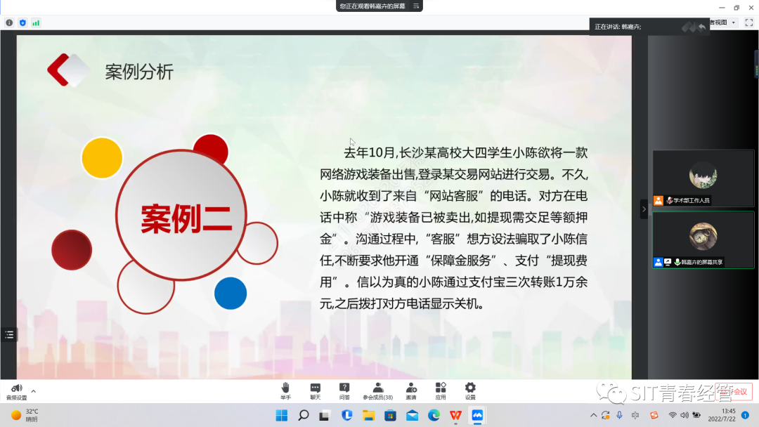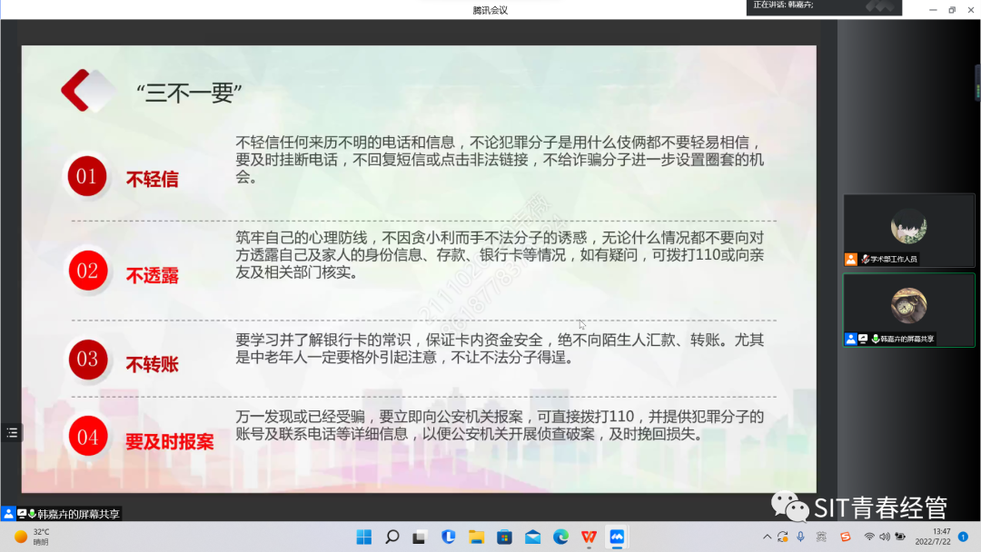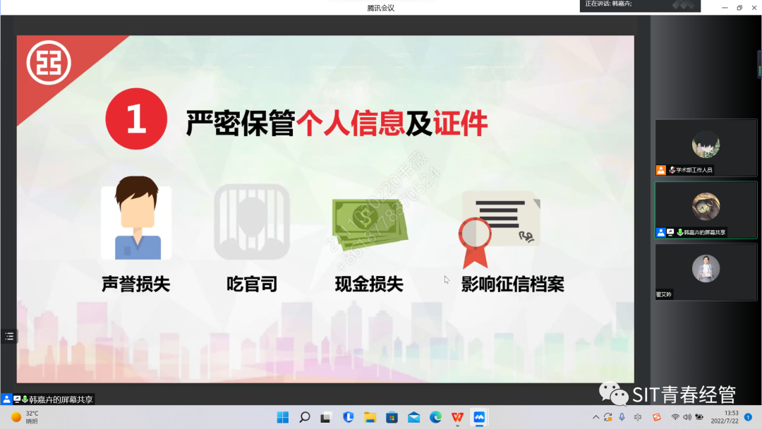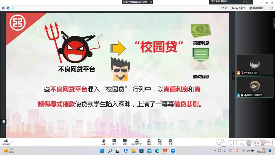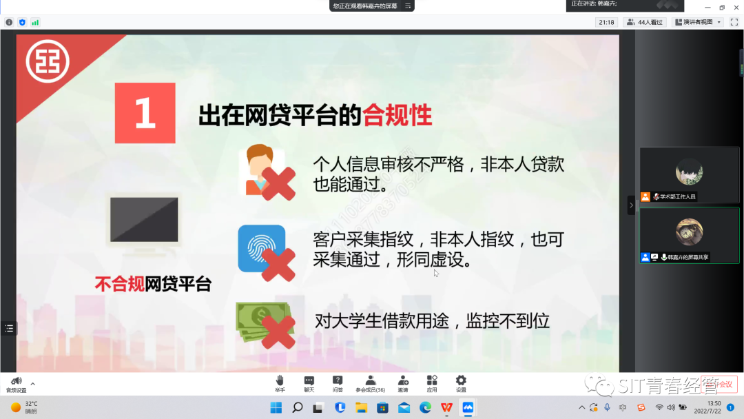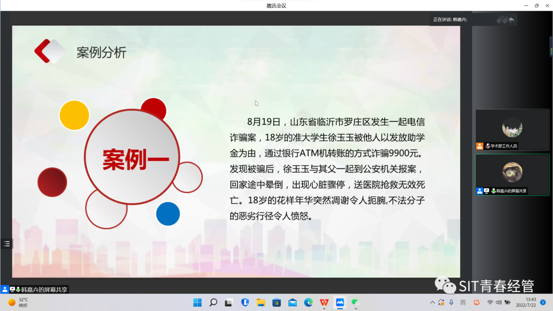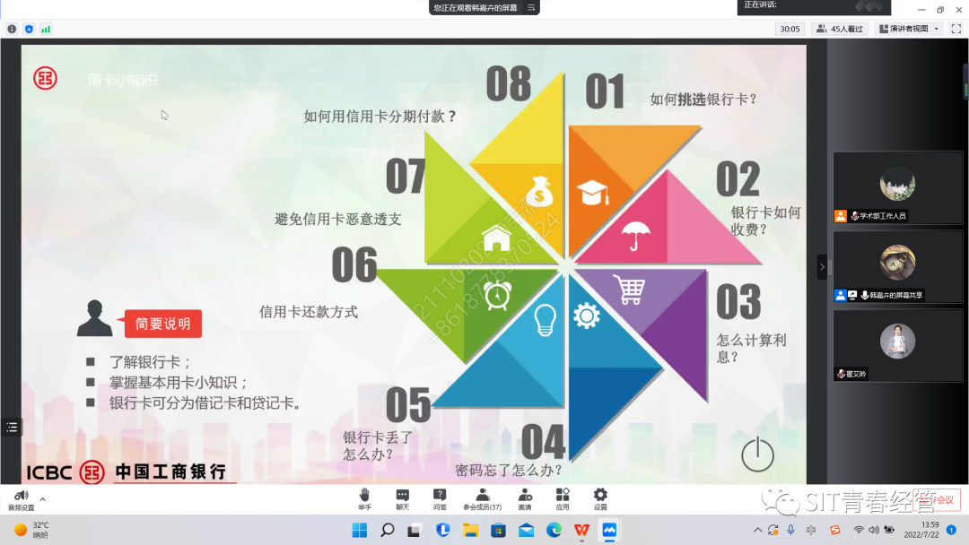 为帮助同学们树立正确的金钱观和价值观,做到理性消费,避免金融风险,2022年7月22日下午,经济与管理学院开展了“金融知识进校园”线上主题讲座。本次活动的主讲人为工商银行淮海中路第二支行行长助理张祯祎、工商银行医学院路支行行长韩嘉卉。
