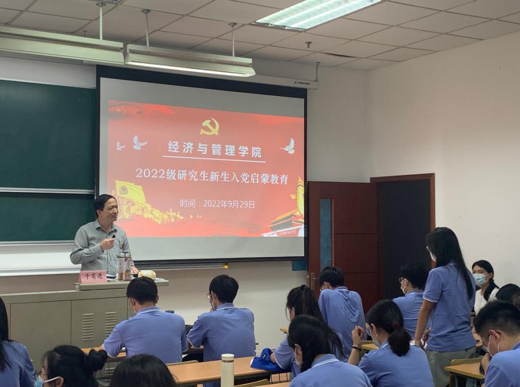 9月29日,经济与管理学院举行了2022级研究生新生入党启蒙教育,特邀校党委组织统战部副部长于有进担任主讲嘉宾,研究生辅导员鲍其雯带领全体新生认真聆听。