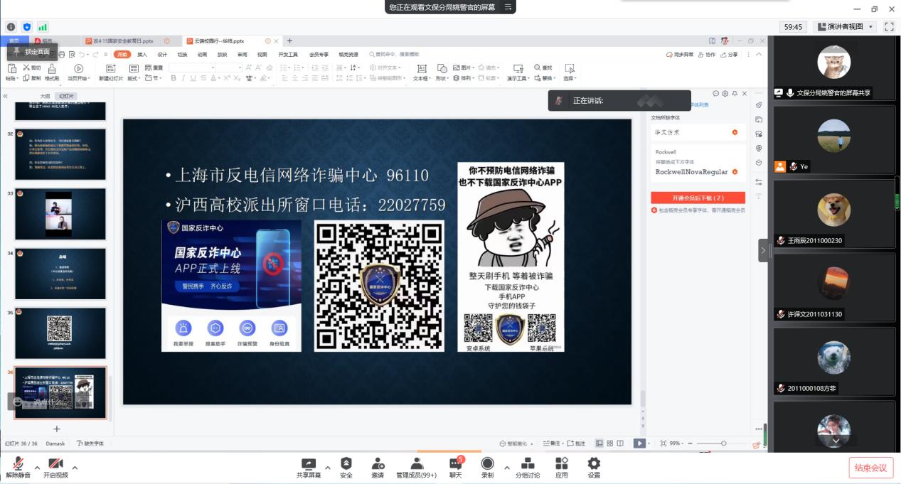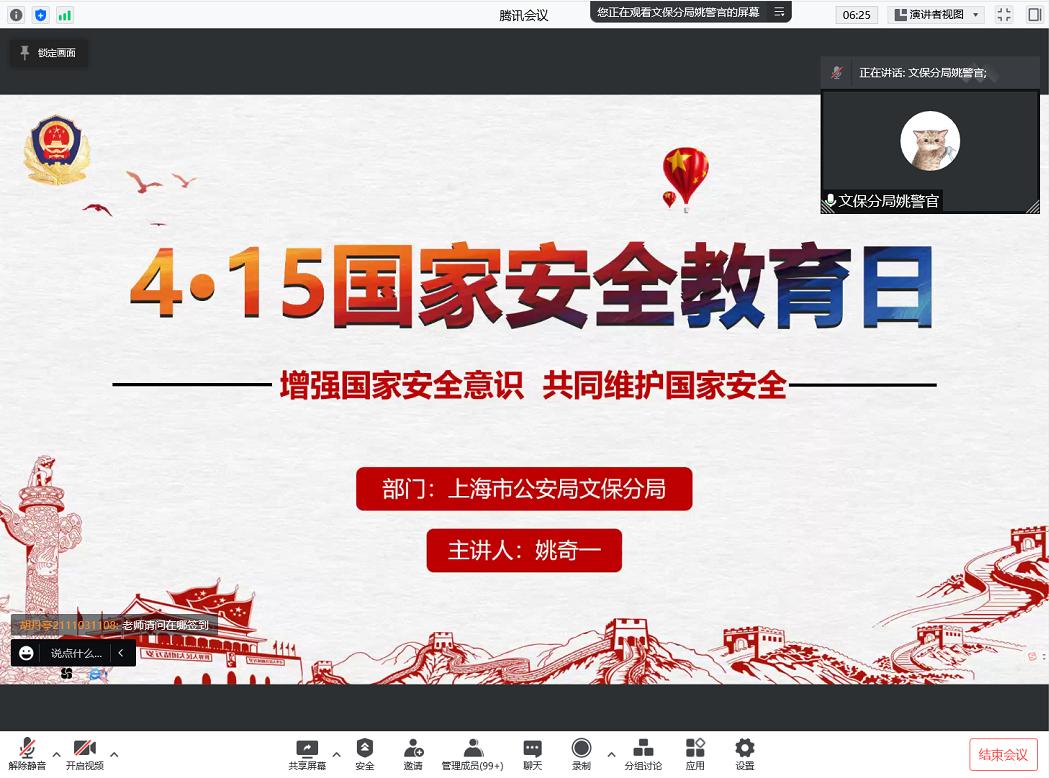 今年4月15日是我国第七个全民国家安全教育日,为做好常态化疫情防控背景下我院学生的国家安全教育,进一步贯彻落实总体国家安全观,切实增强学生反诈防骗、维护国家安全的责任意识,经济与管理学院于2022年4月14日通过腾讯会议开展了国家安全日线上主题讲座,本次活动特邀上海市公安局文保分局所姚奇一警官主讲,共两百余名学生参加,其中包含经管学院学长导航计划的60余名班级小导师,力求形成班级传帮带,发挥朋辈力量,引导更多同学深刻了解总体国家安全观与反诈防骗知识。