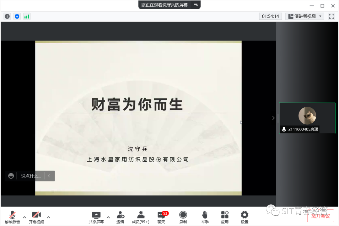 为全面推行劳动教育,树立正确的劳动观、财富观,2022年5月10日晚,经济与管理学院举办“新时代先进人物进校园”线上专题报告会,上海水星家用纺织品股份有限公司党委书记、技术中心总监、正高级经济师、我校外聘教授沈守兵先生为同学们带来了题为“财富为你而生”的精彩讲座。