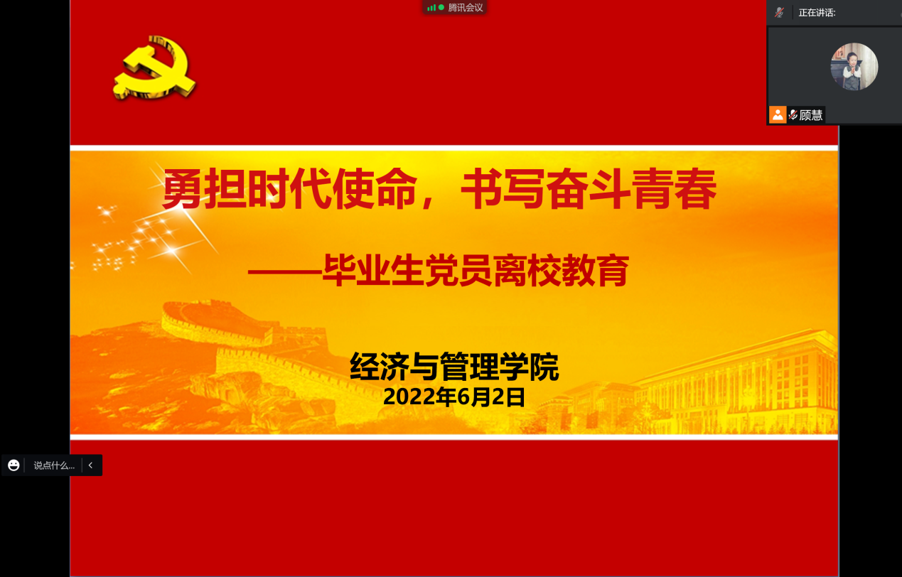 为强化毕业生党员的党员意识,提高毕业生党员的党性修养,坚定毕业生党员的理想信念,引导毕业生党员胸怀祖国、脚踏实地、担当作为,在新的岗位上继续发挥先锋模范带头作用。近日,经济与管理学院党委于线上组织开展了以“勇担时代使命 书写奋斗青春”为主题的2022届毕业生党员离校教育活动。学院党委书记侯建生、党委副书记副院长朱菁、毕业年级党支部书记、全体毕业生党员参加会议,专职组织员顾慧主持会议。