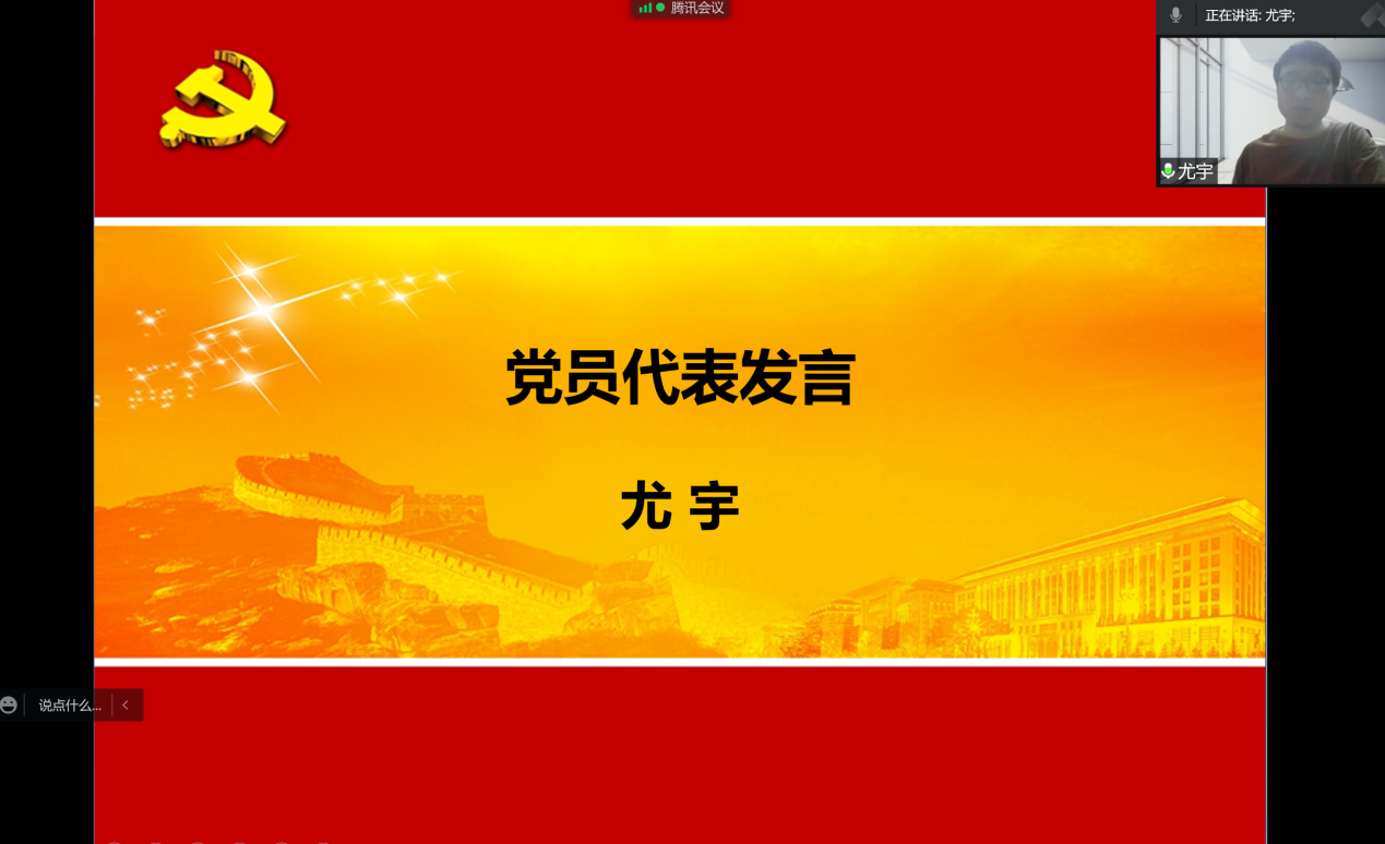 尤宇代表学院2022届全体毕业生党员发言,向学院辛勤工作、无私奉献的领导和老师表达了深切的感谢和崇高的敬意,向全体毕业生党员发出倡议:不管我们毕业后做什么工作,在哪一个城市,在哪一家公司,守住初心,做好自己,牢记自己党员的身份,将党和母校对我们的教育和培养铭记一生。