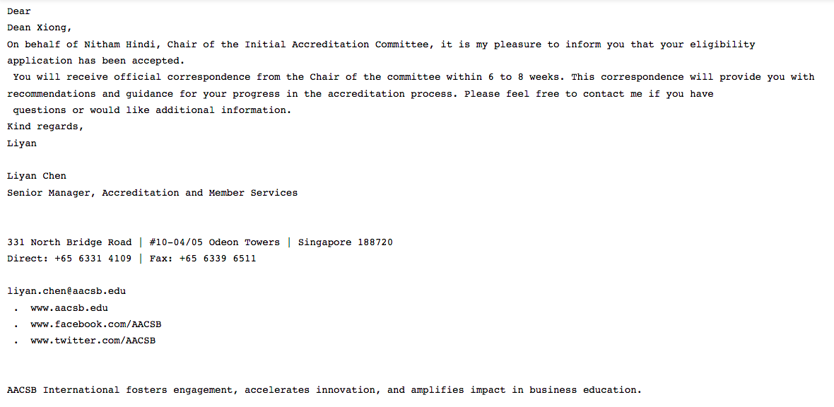 2022年2月4日,经济与管理学院接到国际精英商学院联合会(AACSB)认证委员会邮件通知,正式通过AACSB的资格认证申请(Eligibility Application,EA)审批,这标志着我院正式进入AACSB认证工作的互动阶段,是AACSB认证进程中的重大阶段性成果。