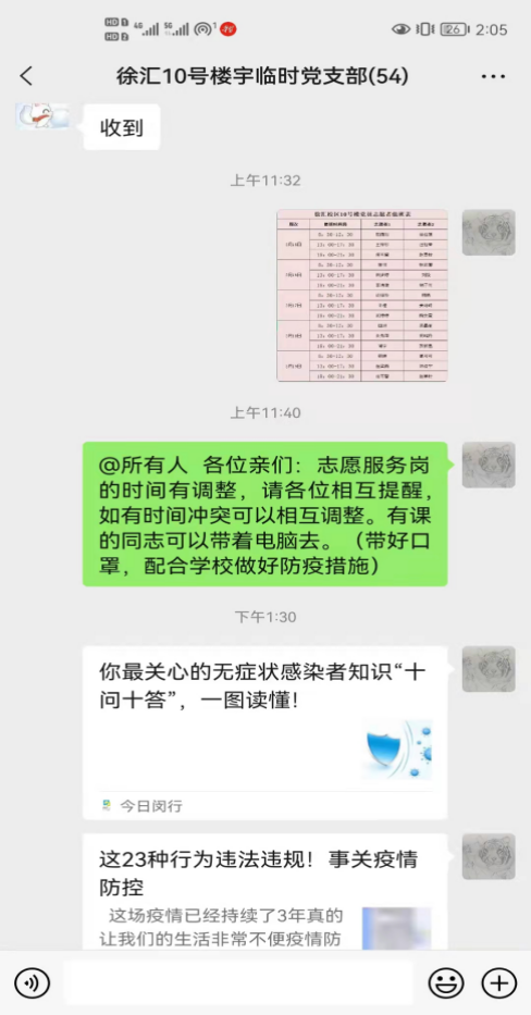 学院工商管理系党支部老师就关于如何提升网络教学水平、保证学生线上学习效果展开充分交流与研讨,保驾护航云教学;院办、实验中心党支部从服务于学生、教师的角度出发,重点强调了疫情下做好与学生沟通工作的重要性,在做好疫情防控的同时管理育人、服务育人;学生党支部迅速搭建双系统管理,建立“楼宇群—组长群—组员”三级网格化管理体系和党员志愿者服务队,组长与党员志愿者共同对楼宇同学云端点对点、人对人精准服务。借助网格化管理模式,以组长为抓手,党员志愿服务岗全天候轮班,积极开展提醒每日健康上报、晚点名、检查发放戴口罩、分时段就餐管控等各项防疫工作,带领全楼同学将学校的防疫措施落到实处。徐汇校区本科生党支部通过分享求职、学习科研、运动生活等经验体会,减轻焦虑,并面向所有毕业班同学开展“战疫不停歇,求职加油站”交流会活动,通过辅导员、已签约同学分享制作简历、面试技巧等经验交流,助力大四同学求职就业。研究生党支部书记在线带领全体党员学习上海市最新疫情防控政策与措施,理解学校各项管控措施的意义与价值,普及“无症状”感染防疫小知识,让全体党员谈感悟,齐行动,共同宣传防疫小知识、严格执行学校的防疫措施,开展了一次有实际意义的党日活动。在疫情防控关键时期,本次疫情防控主题党日活动发挥了党支部的核心战斗堡垒作用,进一步彰显了党员的责任担当和无私奉献精神。