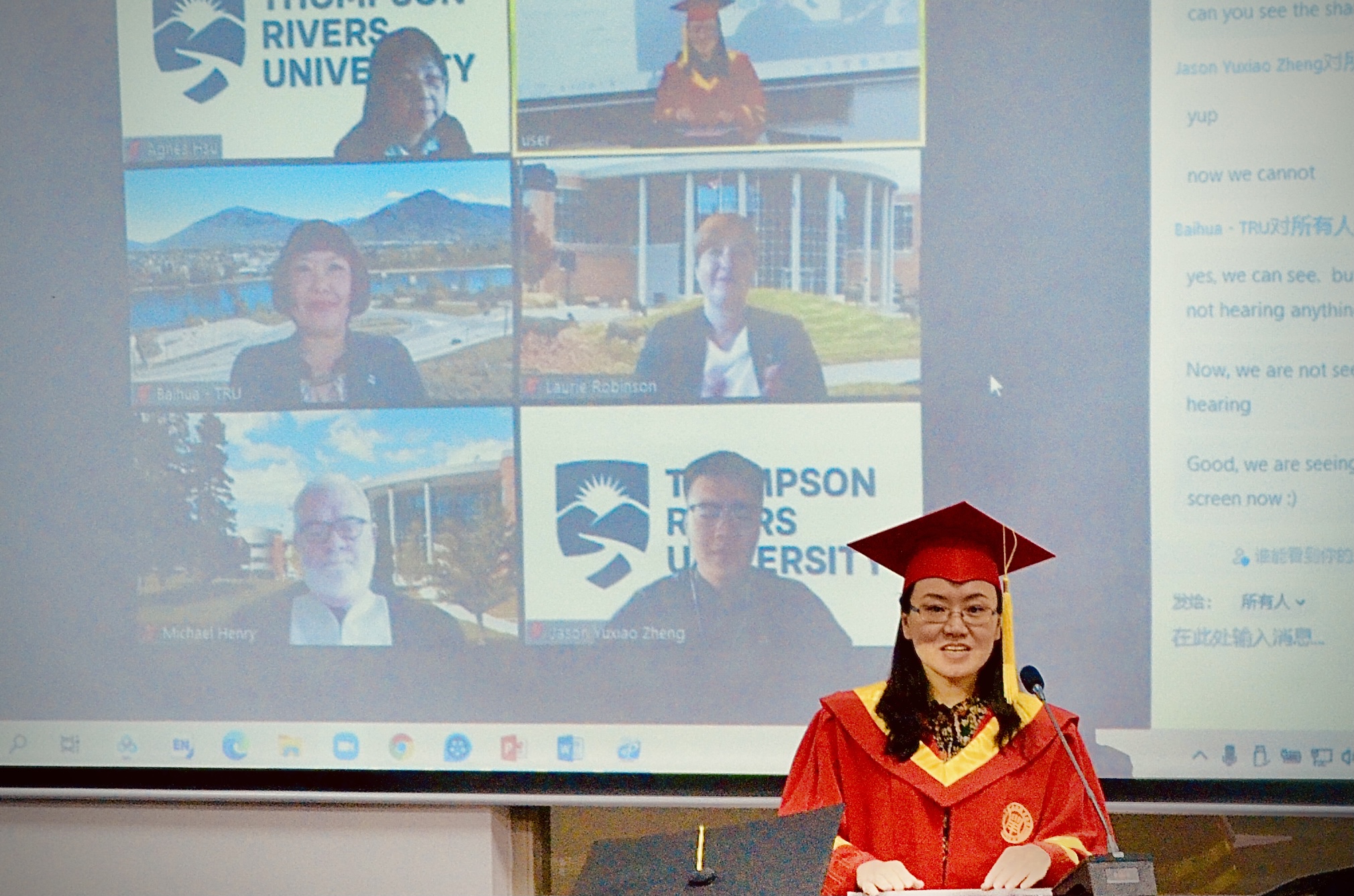 典礼开始前,中加双方领导通过zoom平台进行了简短的视频交流,就疫情条件下,线上办学的多种合作模式展开深入探讨。双方表示要勠力同心,共同克服疫情带来的不利影响,携手面向未来的机遇与挑战,积极推动国际教育交流与合作,不断提升中外合作办学质量,实现上海应用技术大学与加拿大汤姆逊大学中外合作办学项目的可持续高质量发展。
