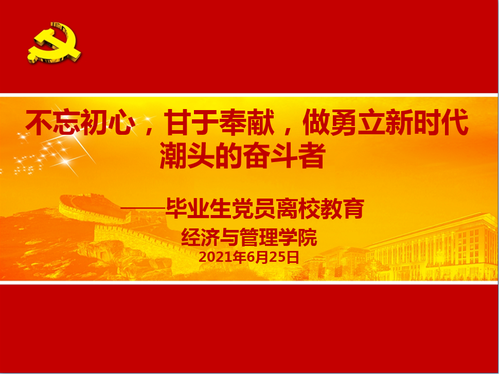根据学校关于毕业生党员离校教育工作要求,6月25日下午,经管学院通过线上线下相结合的形式开展以“不忘初心,甘于奉献,做勇立新时代潮头的奋斗者”为主题的党员离校教育活动。学院党委书记侯建生、党委副书记副院长朱菁、毕业年级党支部书记、毕业生党员代表参加会议,专职组织员顾慧主持会议。