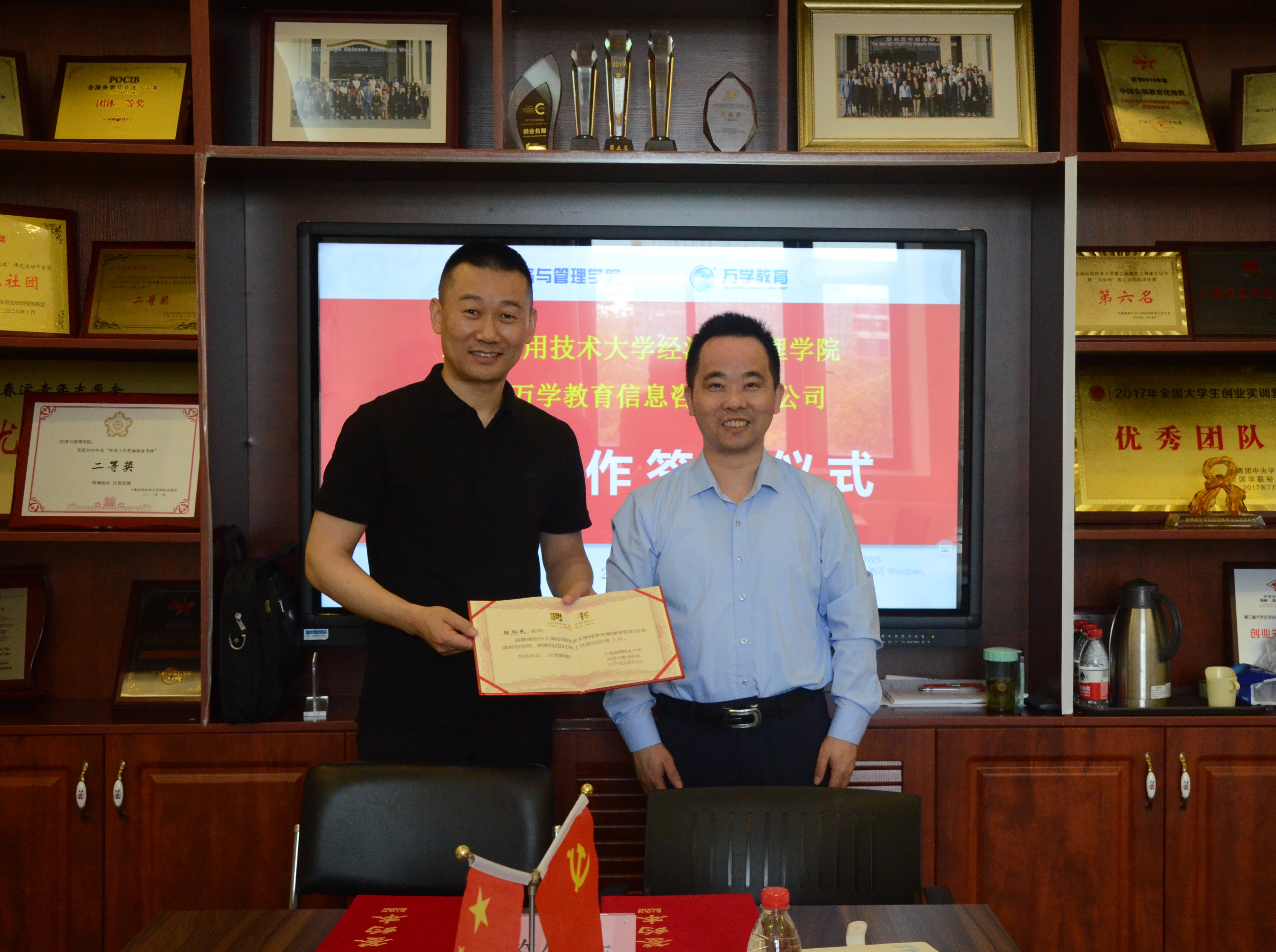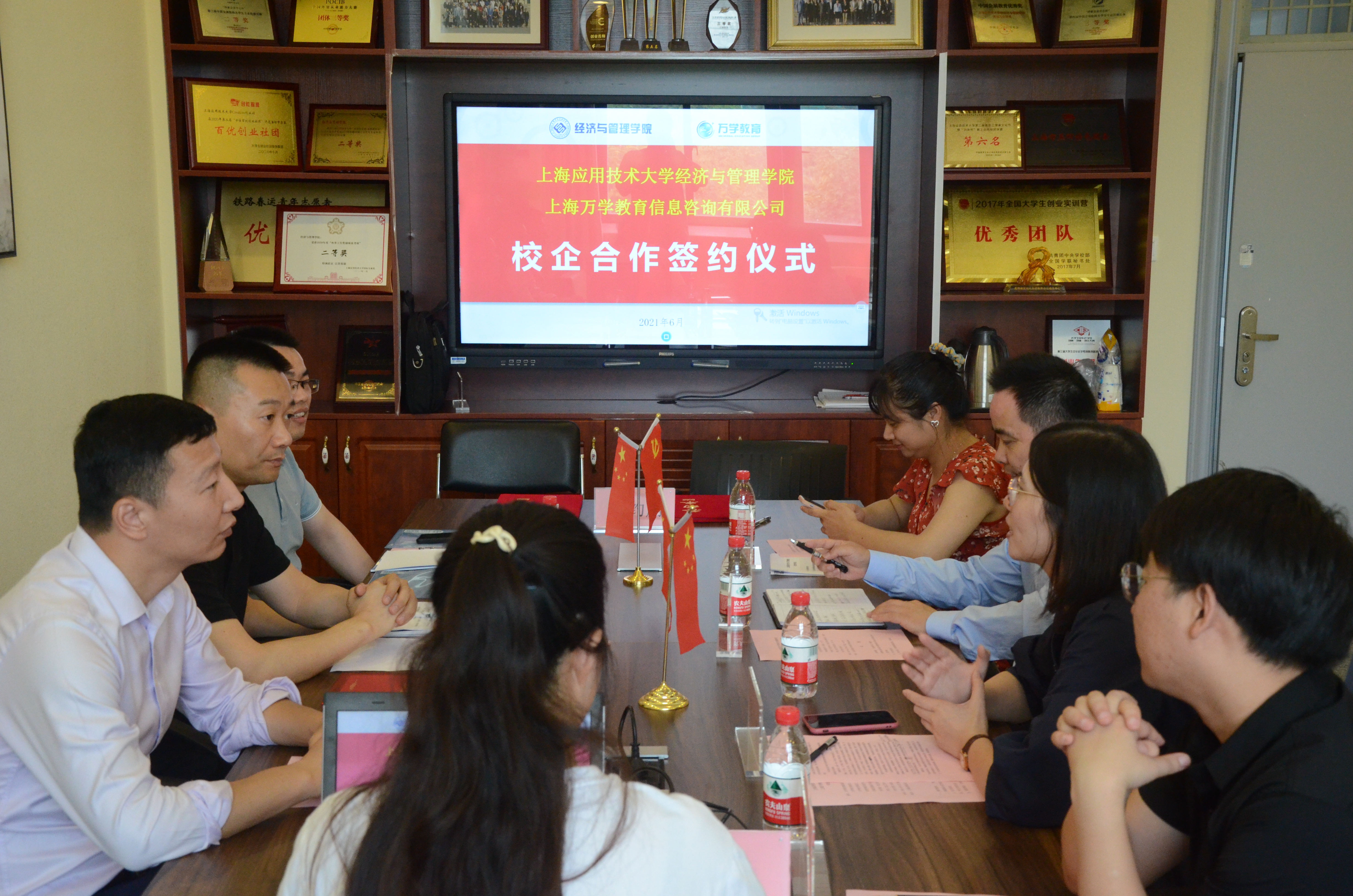 6月30日,经管学院与上海万学教育信息咨询有限公司签订校企合作仪式,上海万学教育信息咨询有限公司(以下简称万学教育)副总裁陆向武,上海分校校长黎仕交,上海南区经理刘海龙,经管学院党委书记侯建生,党委副书记、副院长朱菁和相关师生代表参加。