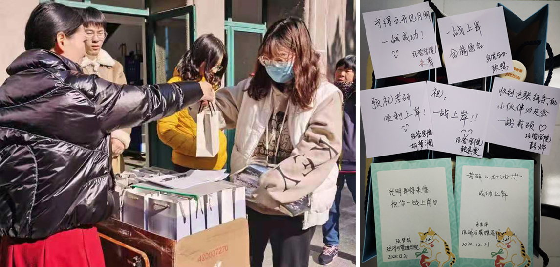 研究生入学考试已进入备战收尾期,为鼓舞经济与管理学院考研学生士气,稳定备考心态,1221日,经济与管理学院老师们在徐汇校区看望考研学子,为同学们送上了考研大礼包,咖啡和巧克力寓意提神助力,好运连连,附上了为他们加油打气的祝福语卡片。