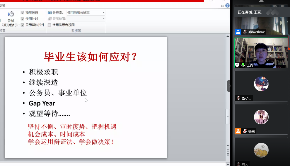 会上,经管学院院长熊焰对当前的就业形势做了深入分析,对学院开展的就业工作进行全面介绍,呼吁学生家长联合学校、学院充分挖掘就业资源,共同为毕业生拓宽就业渠道,抓紧就业。经管学院党委书记王真对当下毕业生的就业心态、就业选择以及职业规划做了详细深刻的剖析,鼓励我院毕业生在当前的严峻形势面签积极应对,主动出击。学院还邀请了会计学专业、市场营销专业、国际经济与贸易专业优秀校友进行面对面的经验介绍和职场分析,引导毕业生摆正心态,从实际出发,多尝试各种就业实习的机会,让自己尽快调整角色,加紧规划自己的人生。会上,学院党委副书记杨雪、专业教师代表王晶、毕业班教务审核负责人、征兵工作负责人、就业辅导员针对就业情况、行业动态、毕业审核、征兵政策等都一一作了详细介绍,通过云端向毕业生和家长充分讲解毕业生各项政策,给家长和学生答疑解惑,协同多方力量共同推进毕业生尽早就业,尽早规划,确保就业工作的顺利开展。(经管学院)