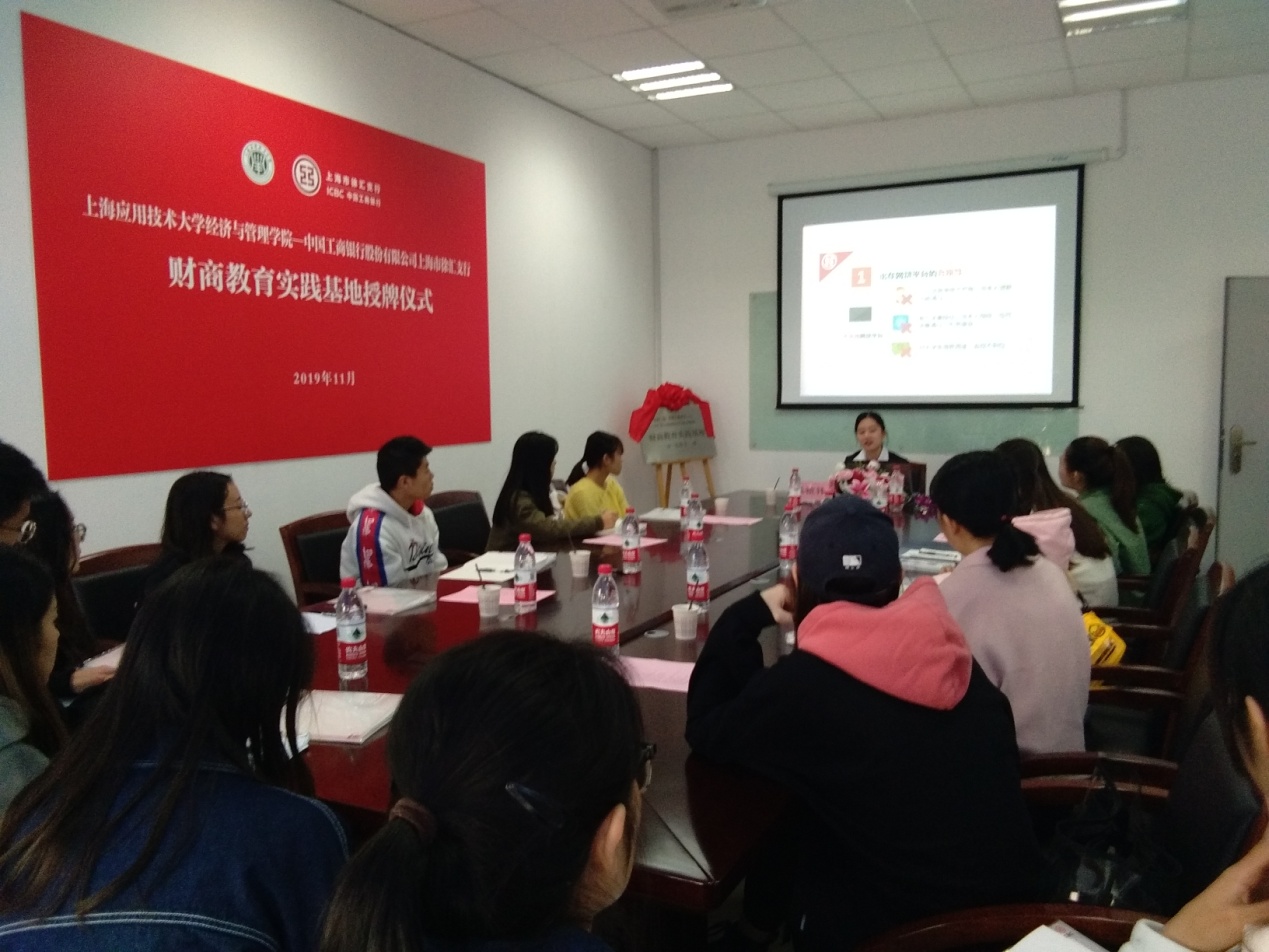 11月15日,经管学院举行中国工商银行股份有限公司上海市徐汇支行财商教育实践基地揭牌仪式暨财商教育培训开班仪式,经管学院党总支书记王真,工商银行徐汇支行副行长虞雯蓉出席,工商银行股份公司代表、经管学院参训师生共约30人参加。