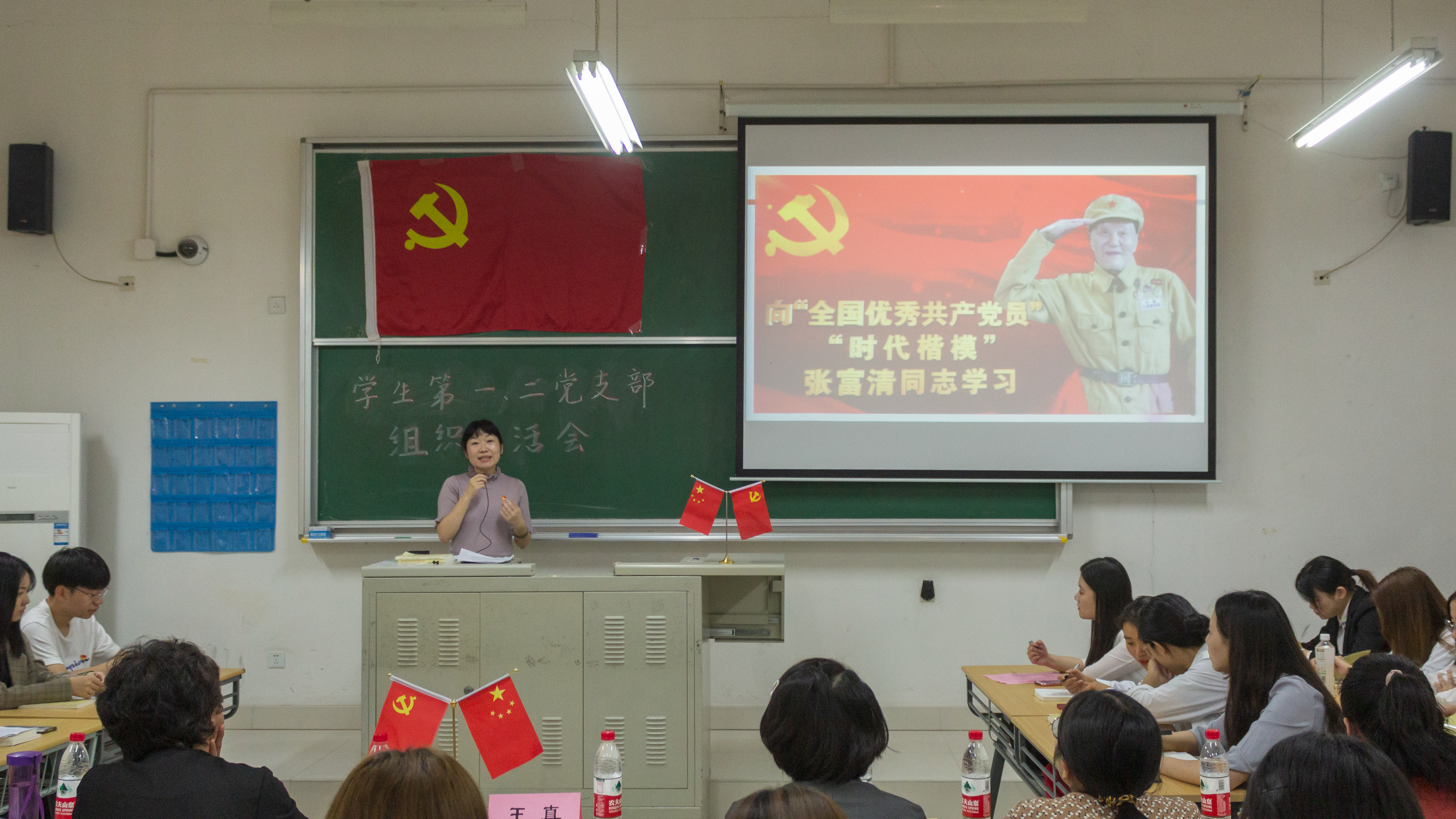 王真通过讲述“共和国勋章”获得者张富清、新时代的“时代楷模”黄文秀、我校全国优秀教师周小理教授及我校优秀学生党员高阳平和郭龙春同志的先进事迹,引导广大学生党员要追随身边的榜样力量,不断锤炼党性修养,永葆共产党员的先进性和模范带头作用。王真向在座的所有党员提问:新时代的青年学生如何从自身做起不断加强党性修养?